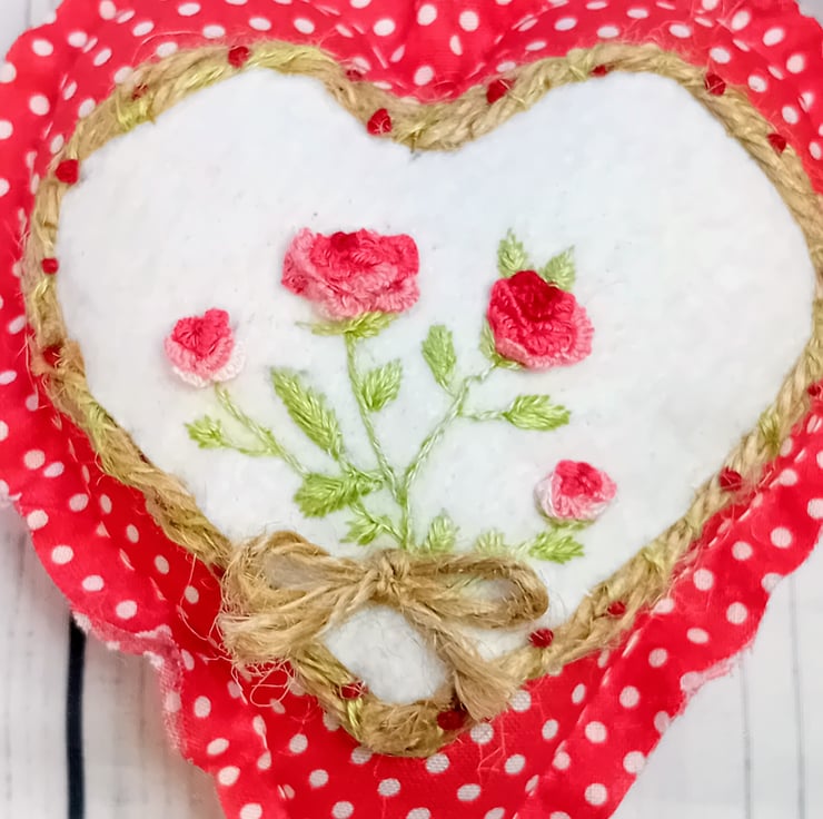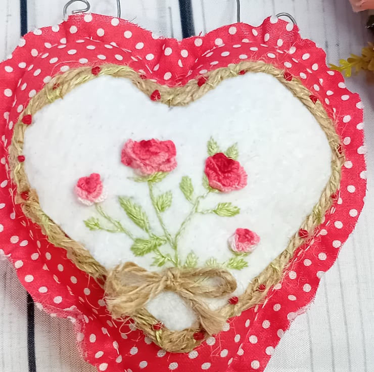 Made with soft white felt, adorned with delicate hand embroidered roses. Framed with a ruffled red polka dot cotton fabric, finished with rustic twine detailing. A rustic wire attached to hang, making it a perfect addition to shabby chic, farmhouse, or cottagecore decor.