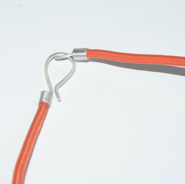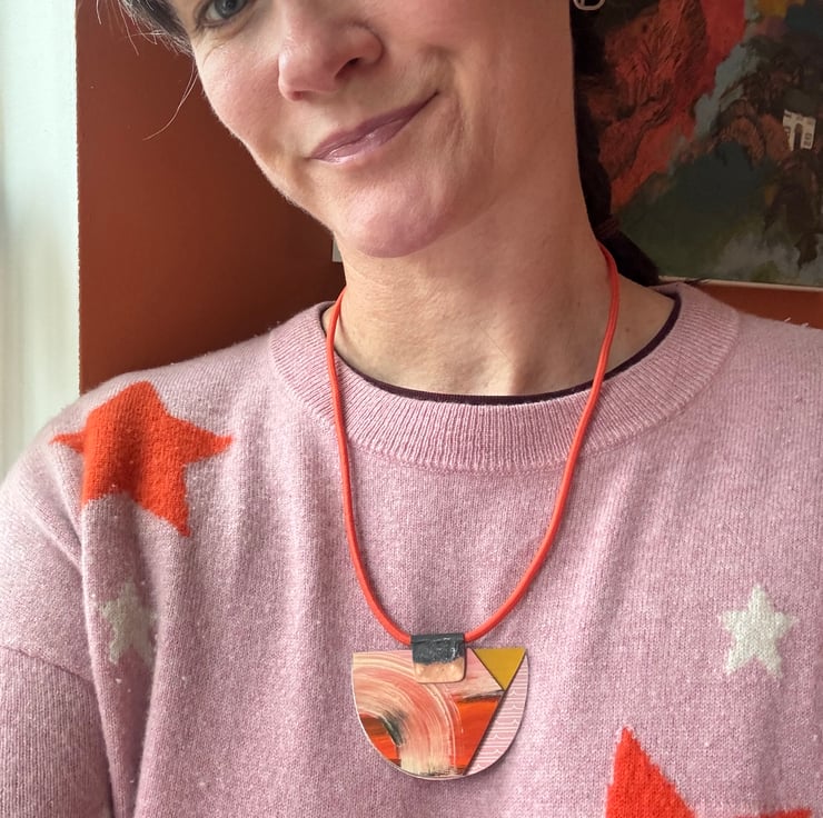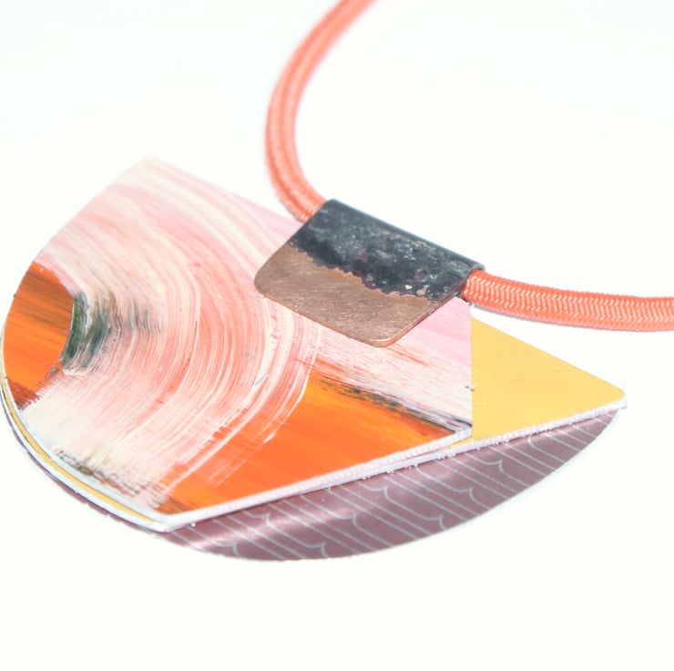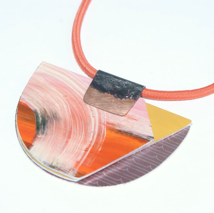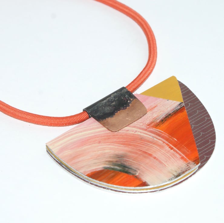 This piece is inspired by my abstract landscape paintings and features 3 layers, 2 of which are hand painted and varnished to seal the paint. The third piece is hand dyed aluminium with my wave pattern. The sterling silver and copper bail that join the pieces are textured and partly oxidised to a dark grey and satin copper finish. The bib necklace is hung from orange bungee cord with a handmade sterling silver toggle clasp.