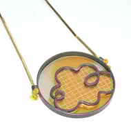 This piece is inspired by my abstract landscape paintings and features 3 layers, 2 of which are hand painted and varnished to seal the paint. The third piece is hand dyed aluminium with my circle pattern. The sterling silver oval joins the pieces together and is textured and polished to a satin finish. The bib necklace is hung from green bungee cord with a handmade sterling silver toggle clasp.