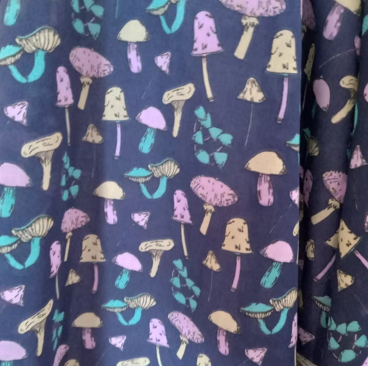 Handmade in Wales 1950s Vintage retro rockabilly full circle skirt, elasticated waist This skirt is made in a polycotton mushroom print on a navy background. It will fit multi sizes dues to the elasticated waist. 28" Long from top of waistband