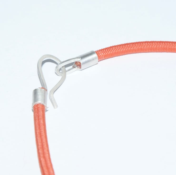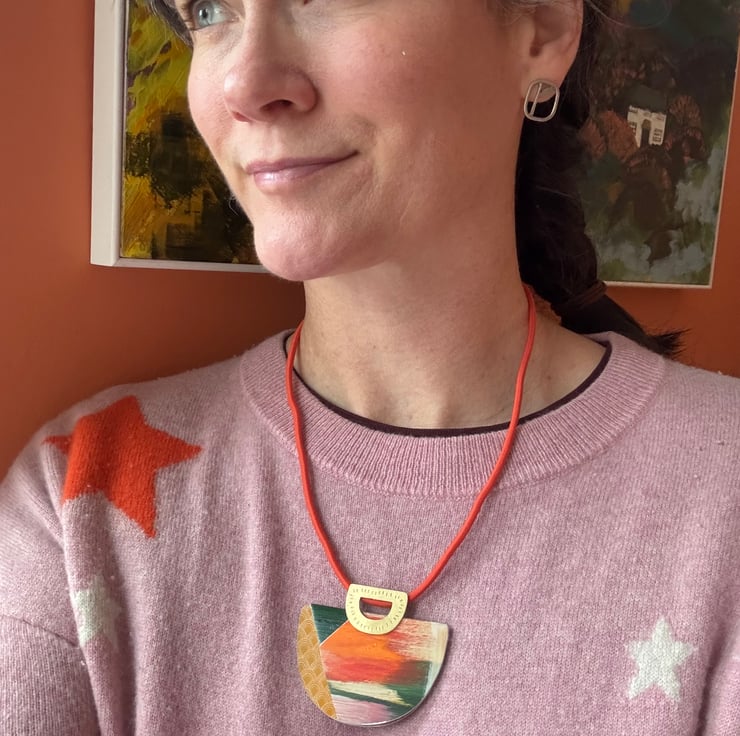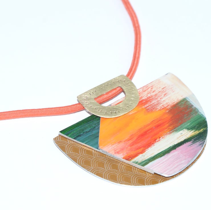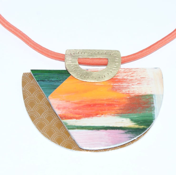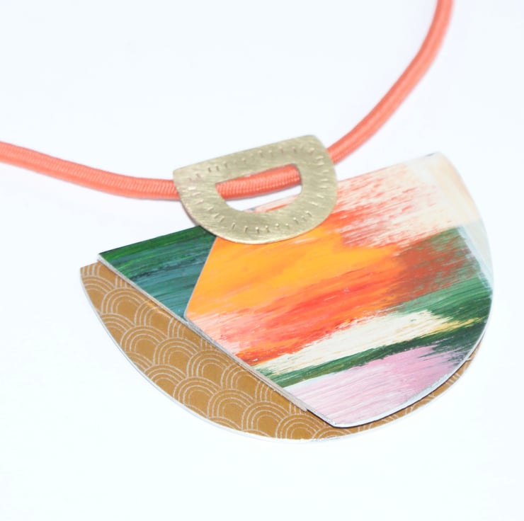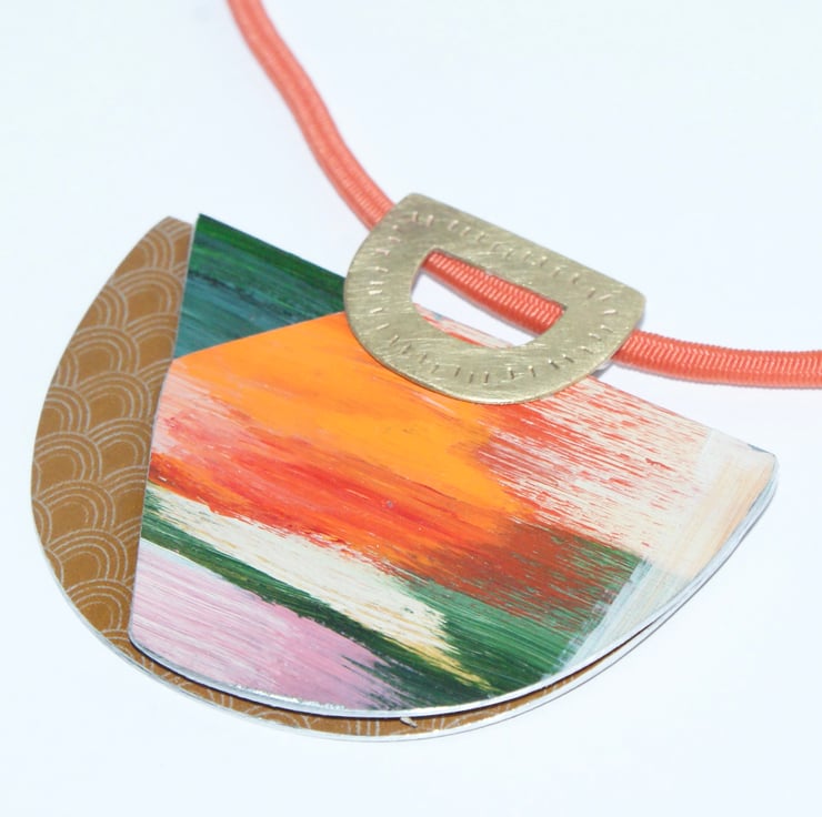 This piece is inspired by my abstract landscape paintings and features 3 layers, 2 of which are hand painted and varnished to seal the paint. The third piece is hand dyed aluminium with one of my patterns. The brass bail that joins the pieces is textured and polished to a satin finish. The bib necklace is hung from orange bungee cord with a handmade sterling silver toggle clasp.