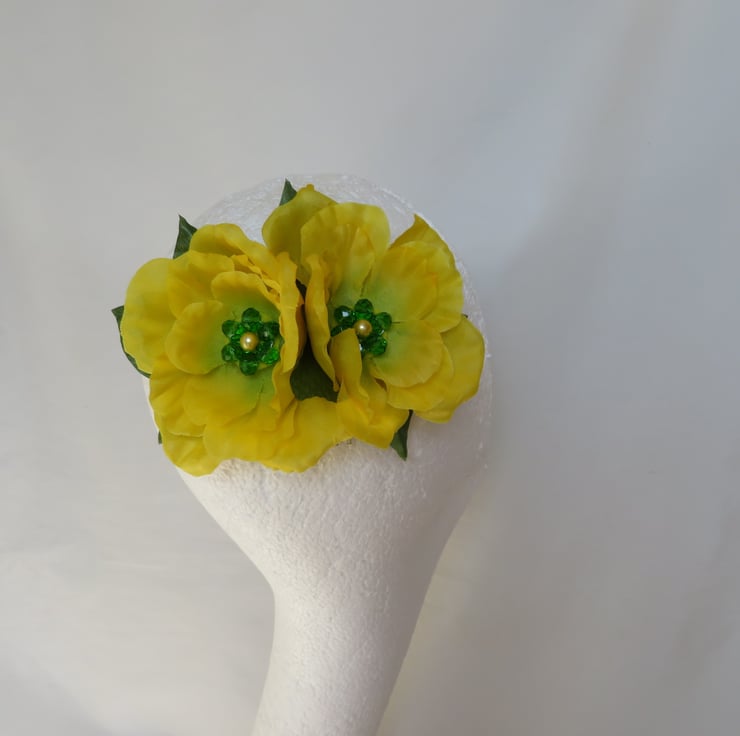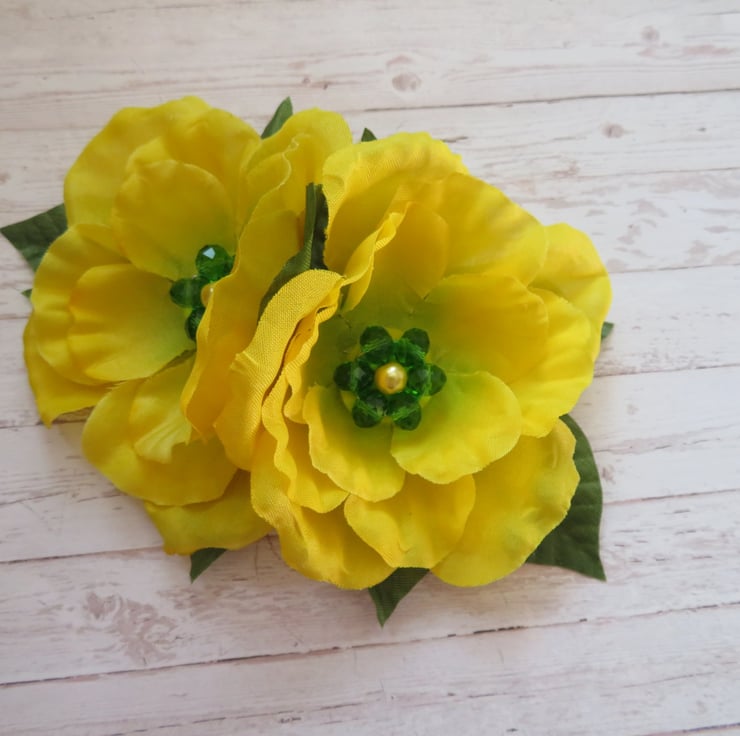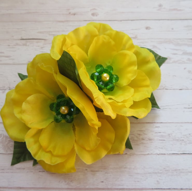 Made with two bright yellow roses with a green crystal cluster and a yellow pearl, backed with green shaped leaves.