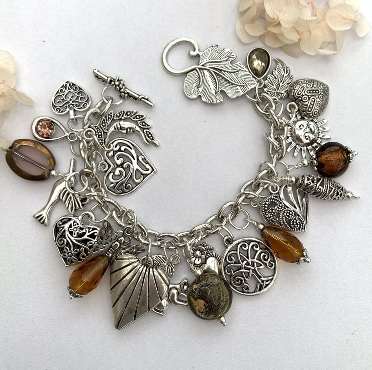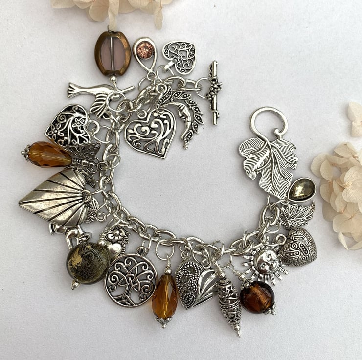 This pretty heart theme charm bracelet is made with a collection of silver heart charms, nature charms plus glass and gemstone charms.