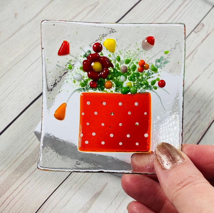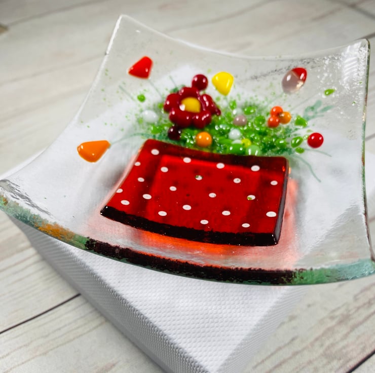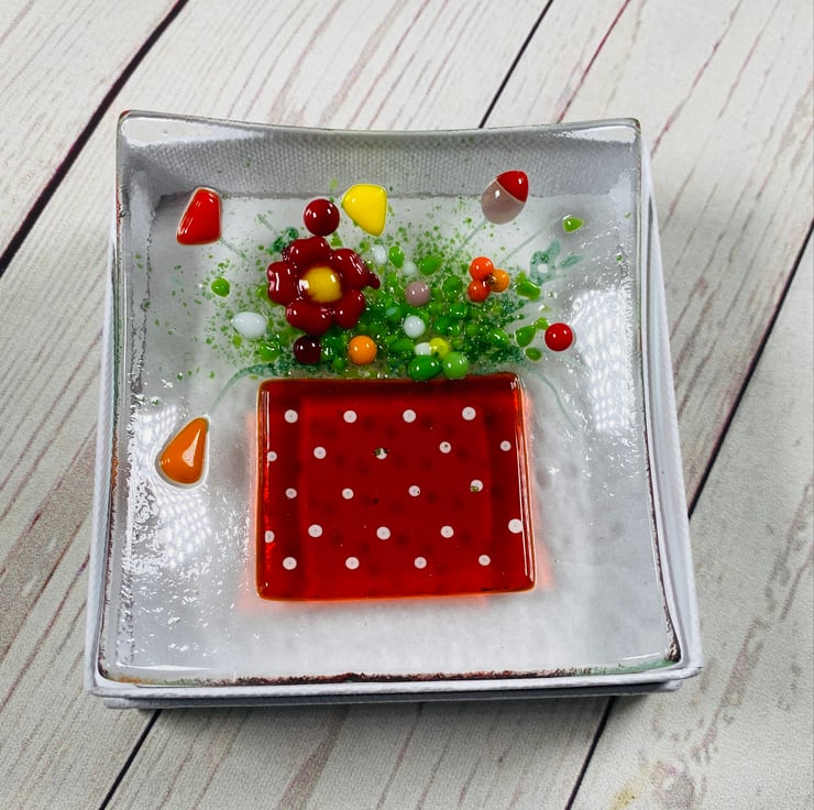 Gorgeous fused glass trinket dish with red polka dot flower pot design . Designed to keep your small jewellery items in, or simply as a decorative ornament . Very feminine. Each dish is slightly unique due to the handmade nature of the glass . This design takes 3 separate glass firings - each around 24hrs long . The trinket dish comes in a white presentation box and measures approximately 3.5 inch square