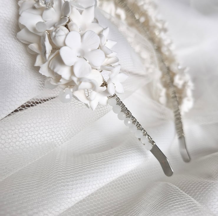 Placed within some flowers and around the headband, there are white glass beads and tiny white crystal beads that shimmer when the headband moves. This beautiful statement piece is perfect for a Bride or Bridesmaid.