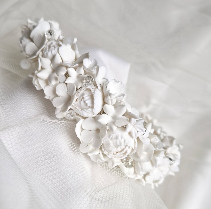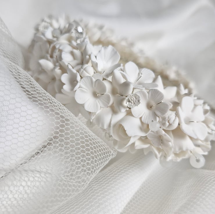 Each Flower has been handmade by myself with polymer clay. The headband base is silver & wrapped with silver plated wire holding the flowers in place.