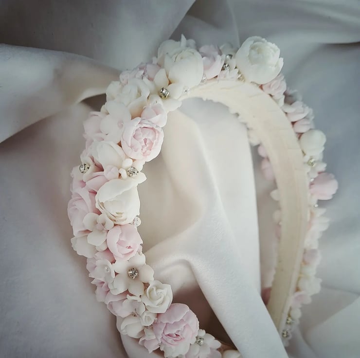 A Beautiful floral Headband with delicate handmade soft white and light pastel pink flowers.