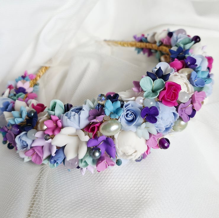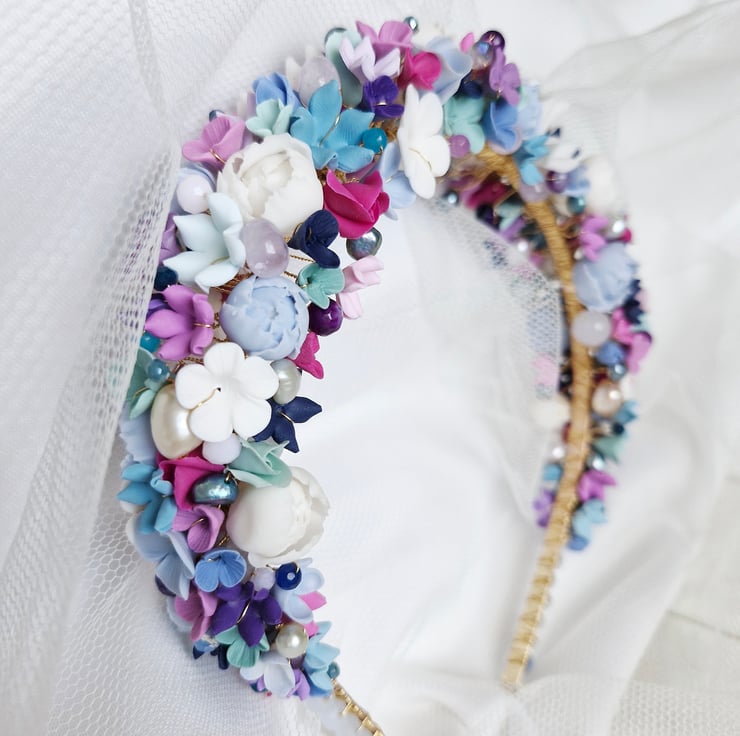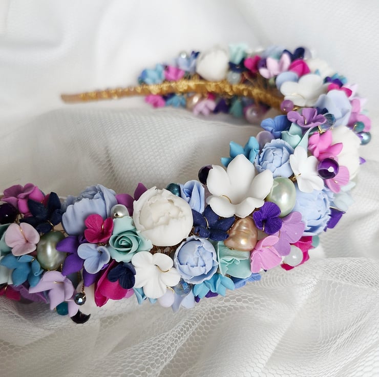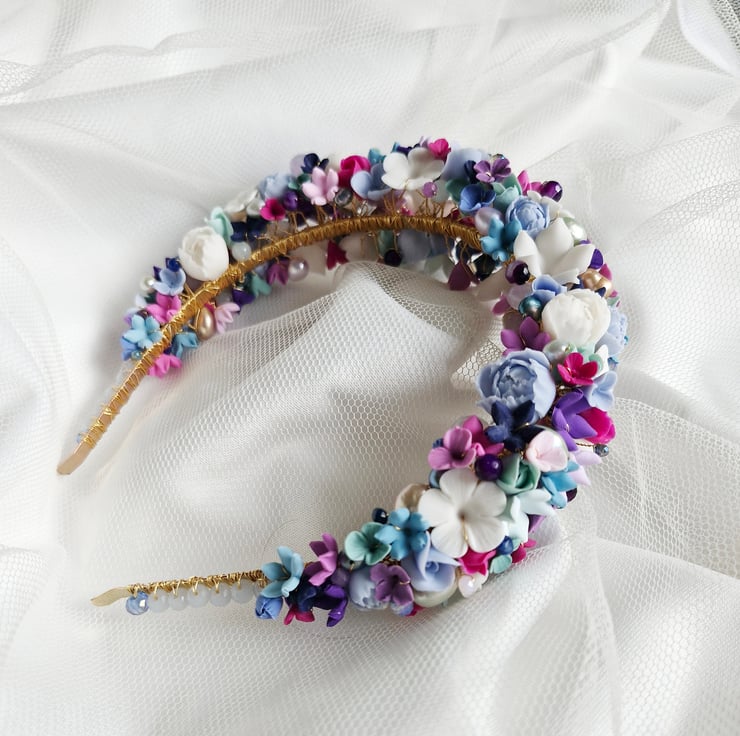 Each Flower has been handmade by myself with polymer clay. The headband base is gold & wrapped with gold wire.