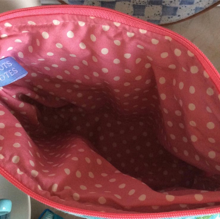 Made from a preloved fabric, this lovely Toots Totes “Zinnia” purse has a pretty pink spotty lining in new cotton fabric and a coordinating zip and beaded zip pull.
