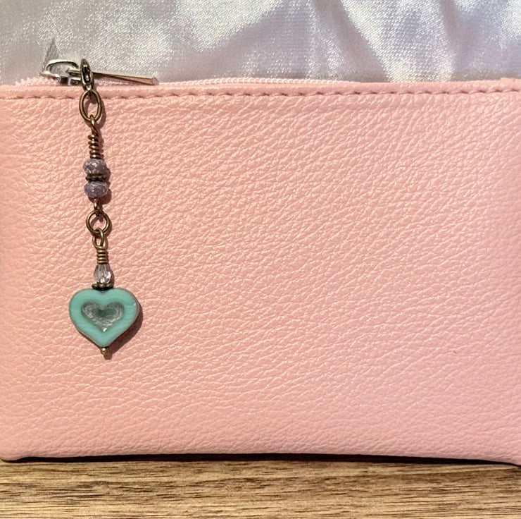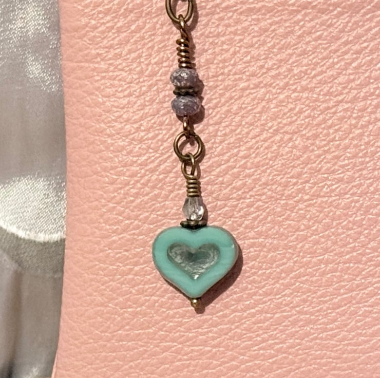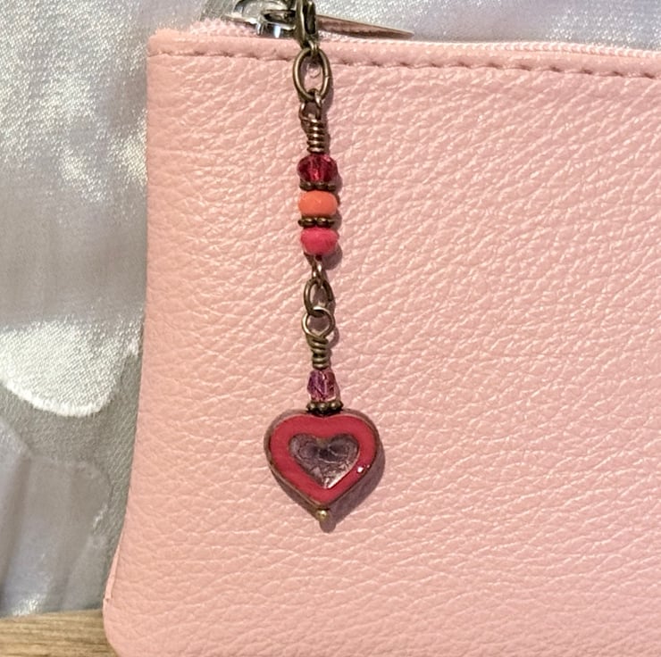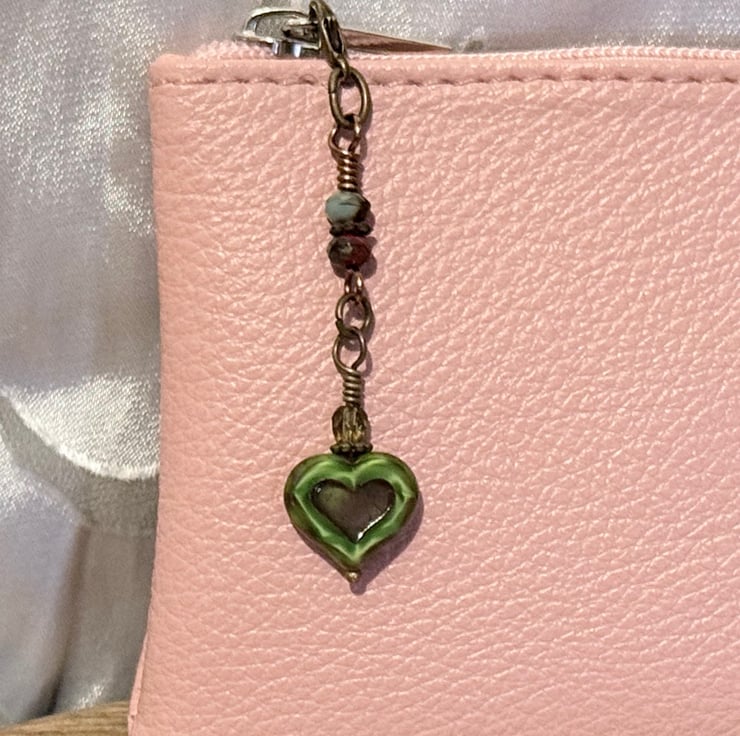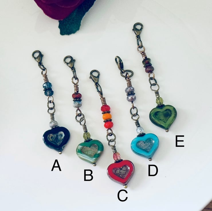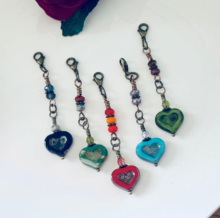 Small handmade zip charms made with an assortment of Czech glass beads. The main focal is the chunky little hearts that have been paired with smaller fire polished beads.