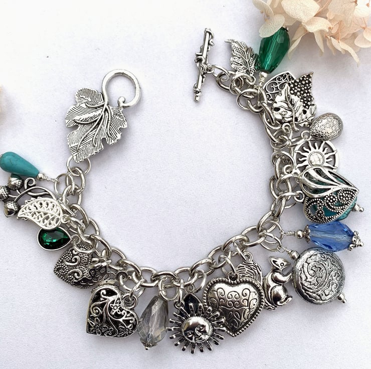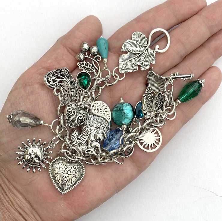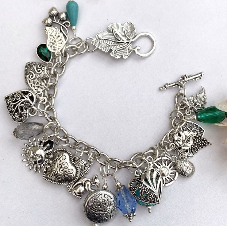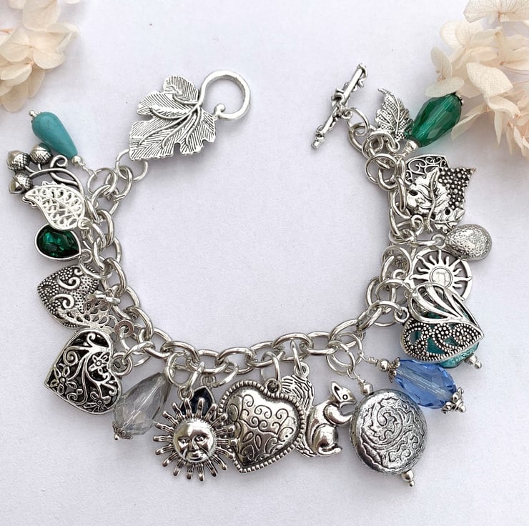This pretty heart theme charm bracelet is made with a collection of silver heart charms, nature charms plus blue glass and gemstone charms.