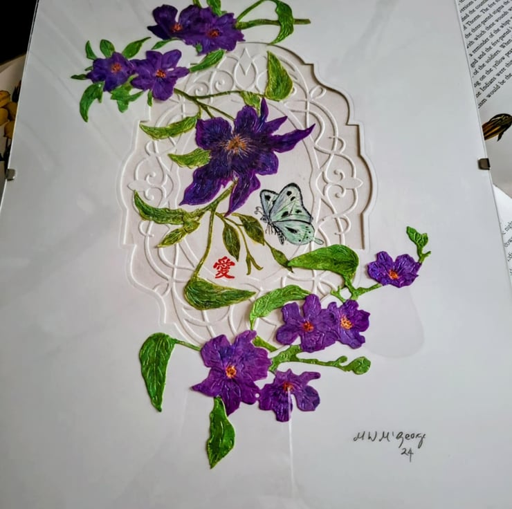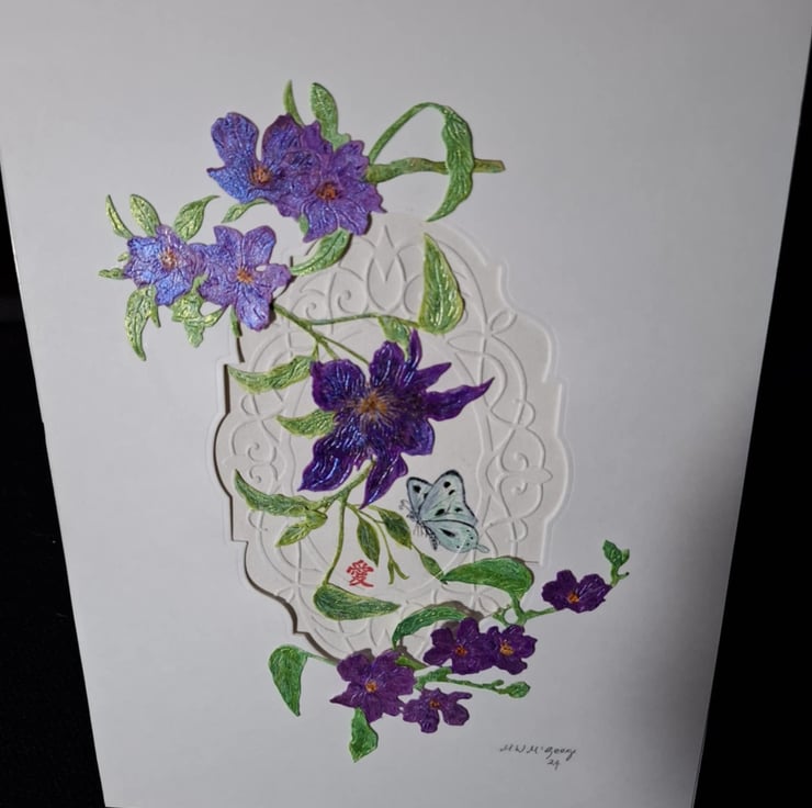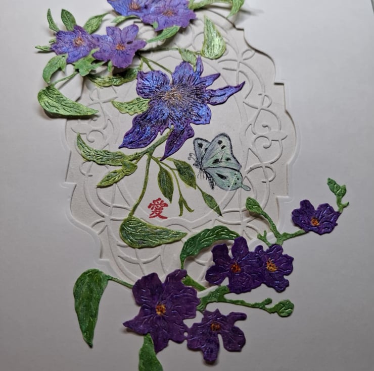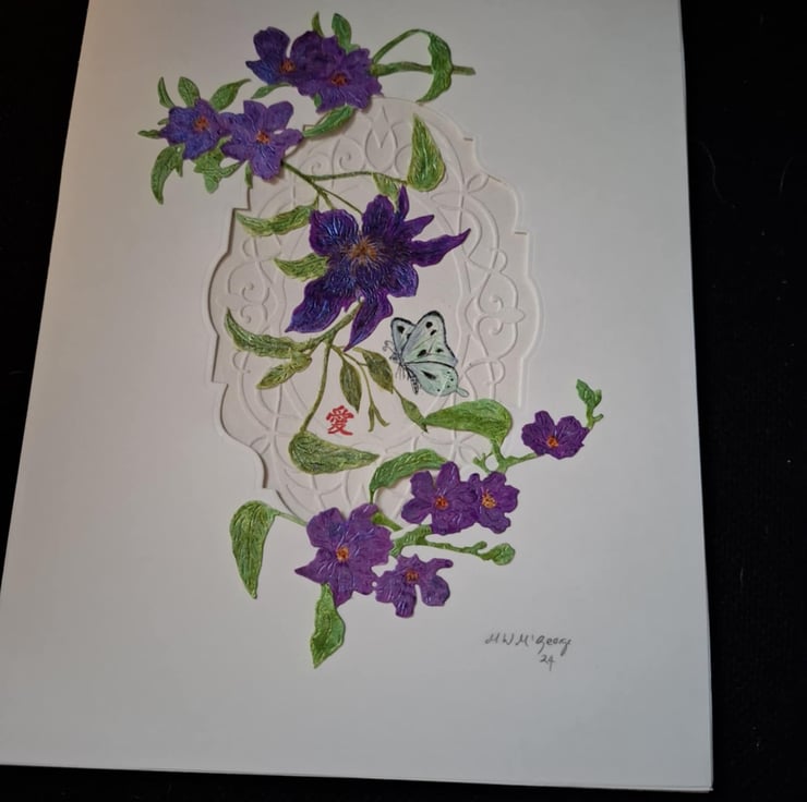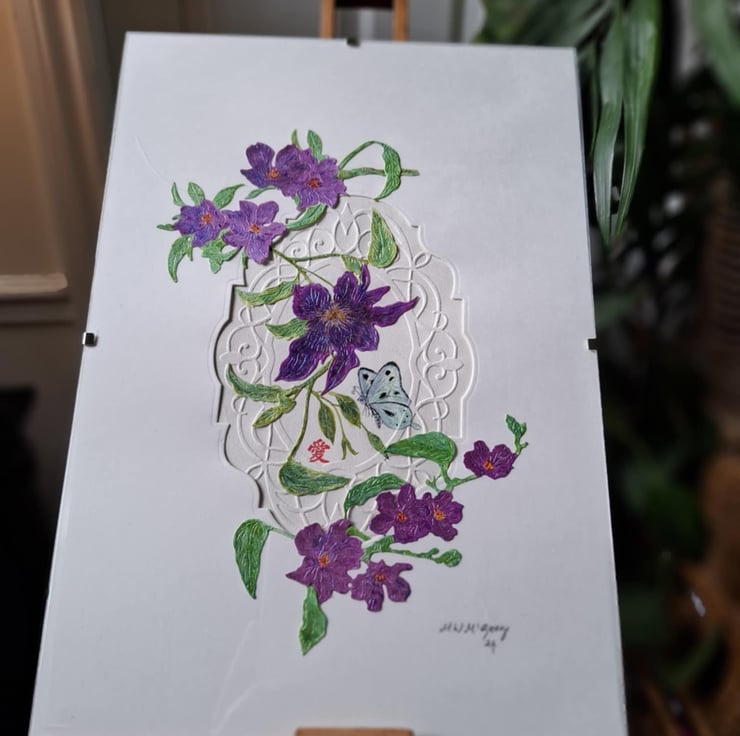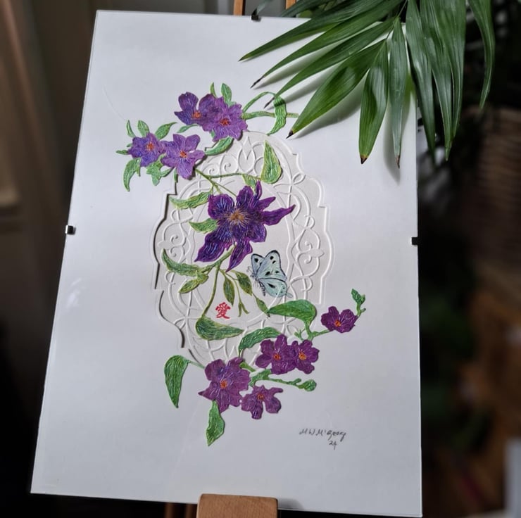 An Exquisite Original Water Colour And Mixed Media Picture Entitled Exotic Flora And Fauna, The Design Done In Water Colour And Mixed Media And Embossing Shows A Beautiful Purple Clematis Being Visited By A Beautiful Chinese Handkerchief Swallowtail - Papilio Dardanus Butterfly, The Scene Draws You In To A Moment Of Shear Peace And Tranquillity Where You Could Almost Be Transported To An Exotic Country With Sounds Of Songbirds In The Flora And Exquisite Butterflies Fluttering By, The Pic Is Framed In A A4 Perspex Clip Frame As Shown In One Of The Pictures, And The Embossed And Painted Mount Gives The Picture Extra Depth And Realism To The Art Work And Subject, Which is Lovingly Created For Your Enjoyment Also Prices Reflect The Hours Of Creating This Unique Art Piece And Quality Of Materials Used.