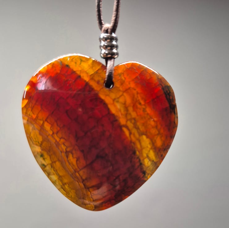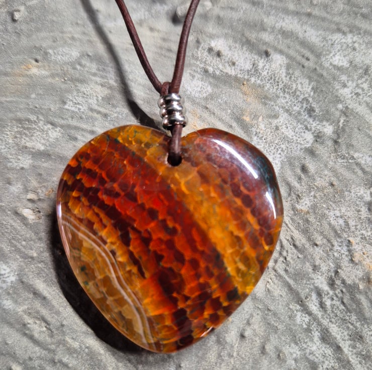 Enchanting brown dragon vein heart pendant on brown leather cord with stainless steel connectors and slider.