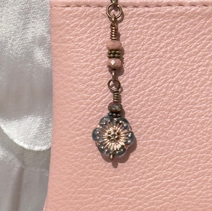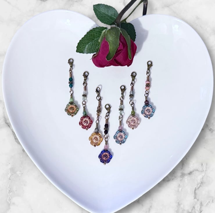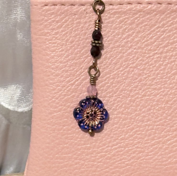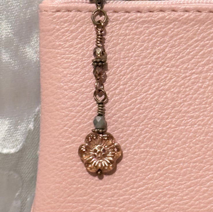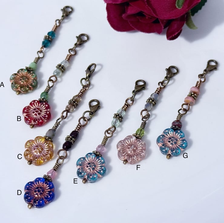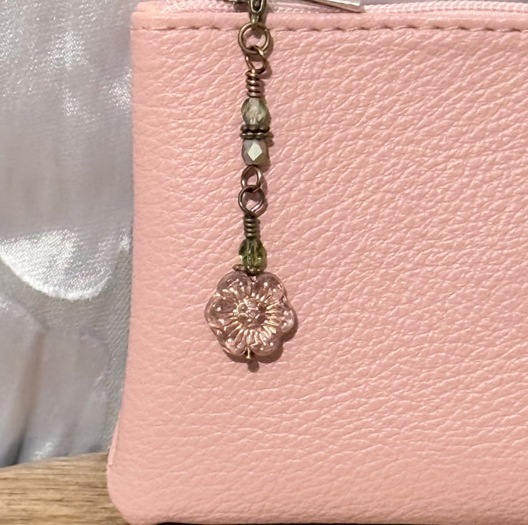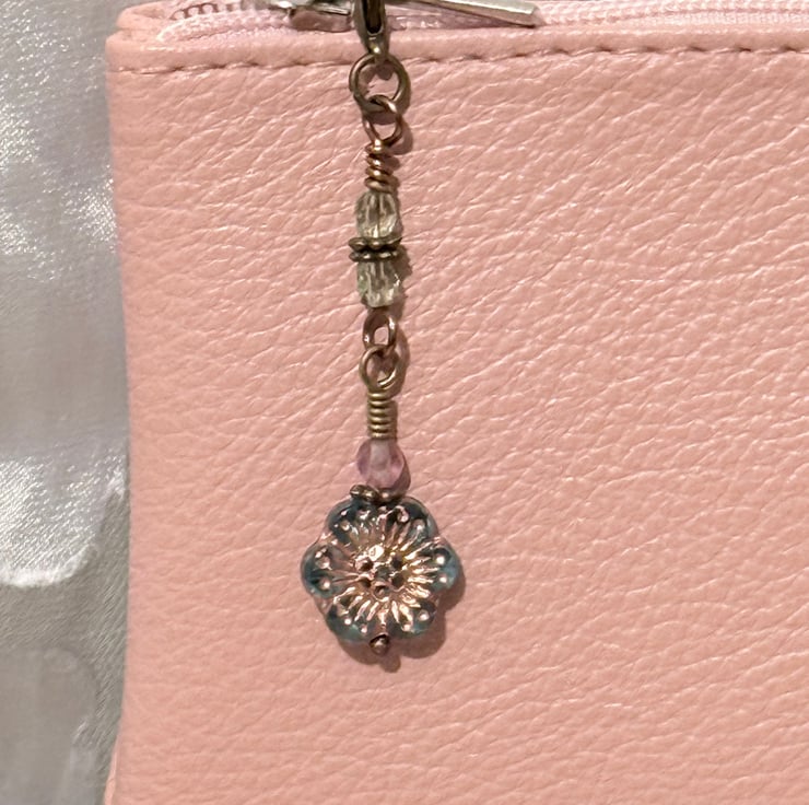 Small flower purse or zip charms made with an assortment of Czech glass beads. They have been handmade by me using colourful pansy flower and fire polished beads. each charm hangs from a small lobster clasp that can be attached to a purse zip or any small zip.