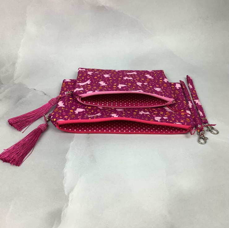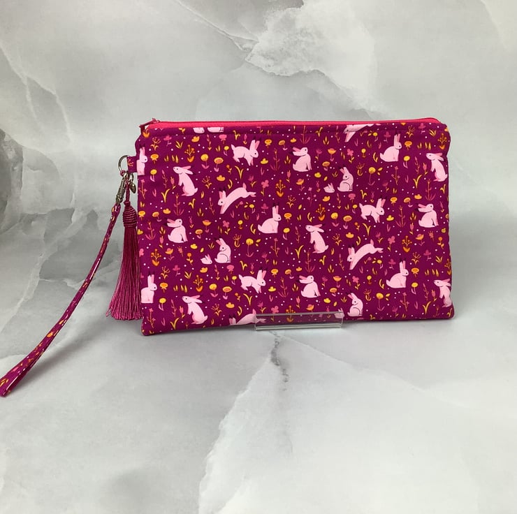 Handmade zip clutch bag in a fun modern bunny rabbits cotton fabric lined in pink spotty cotton and in a choice of 2 sizes.