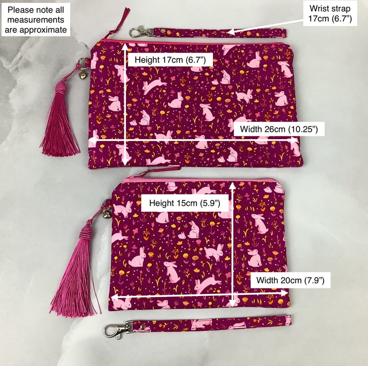 The detachable wrist strap is long enough to fit comfortably on your wrist or forearm and finished it with a silky tassel, charm and ribbon on the zipper pull.
