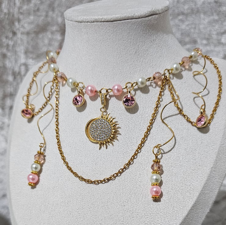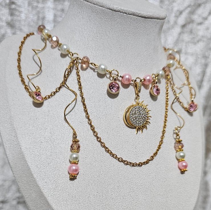 At its heart lies a stunning 24kt gold-plated sun, radiating warmth and light, surrounded by a harmonious blend of soft pink and white glass pearl beads.