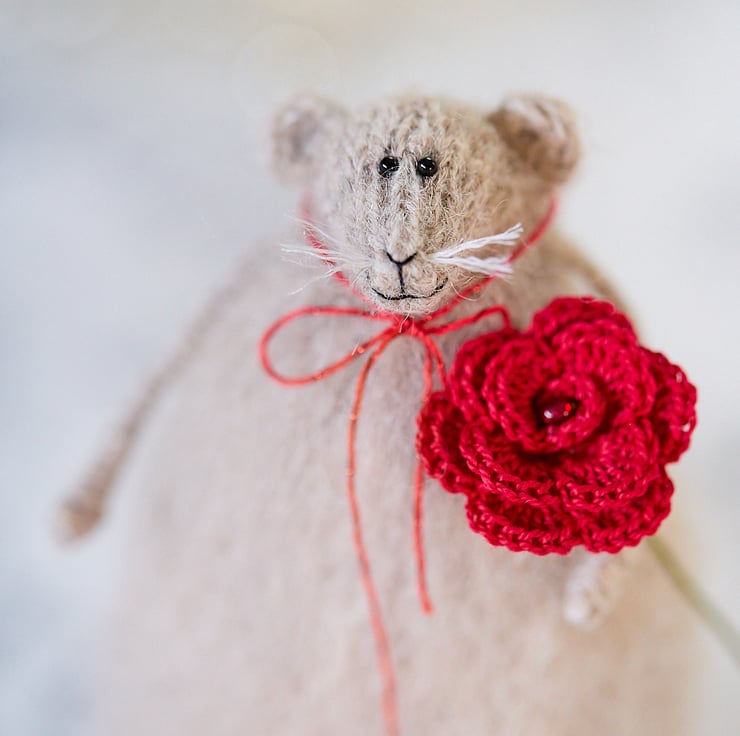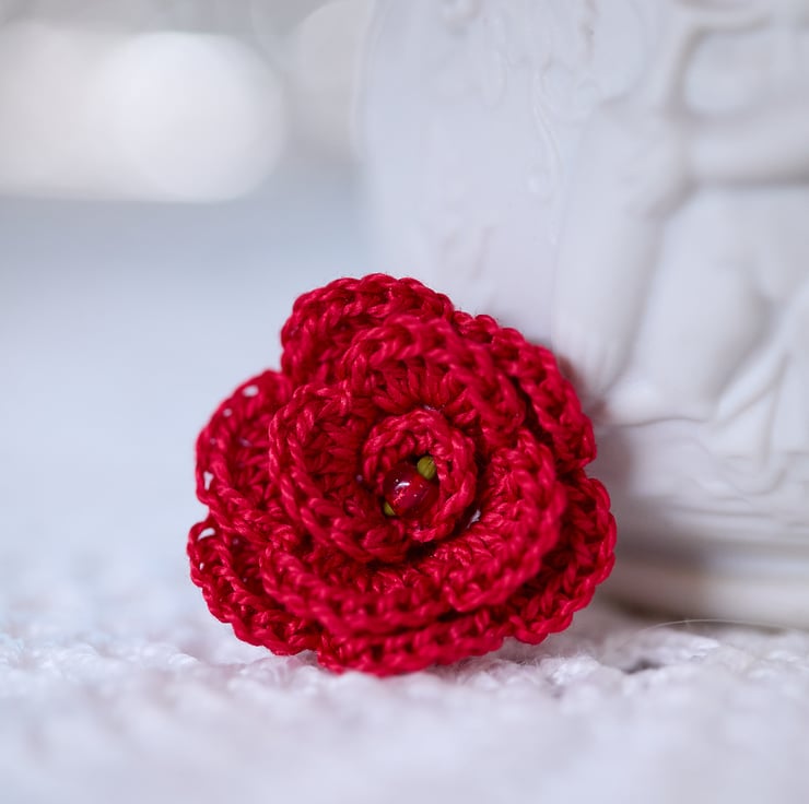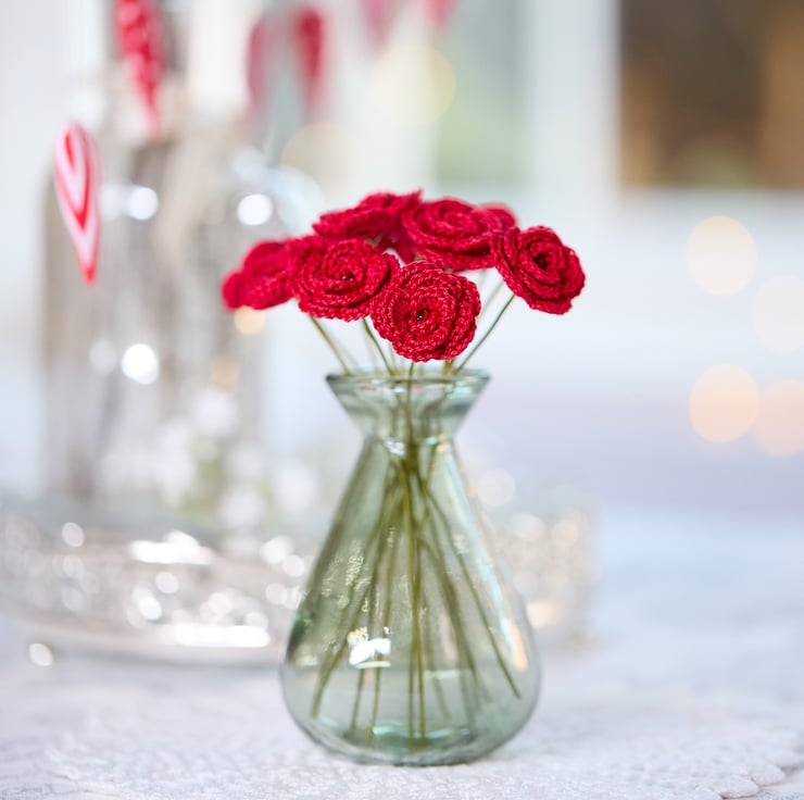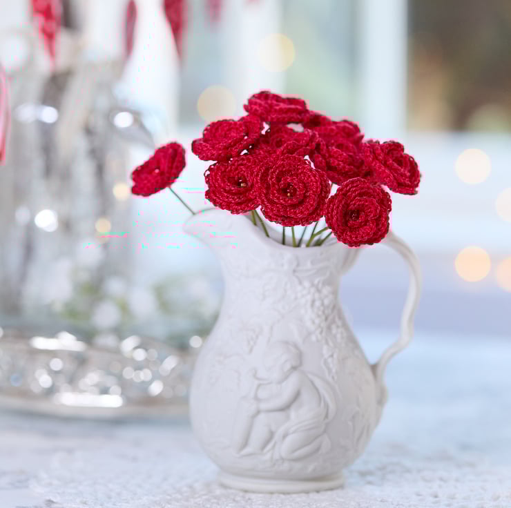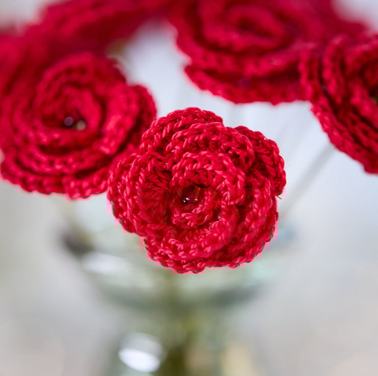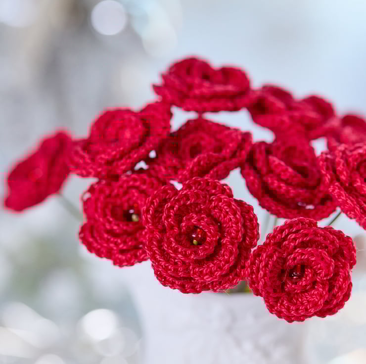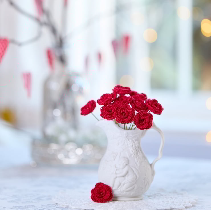 Miniature crochet roses in vibrant red - a perfect St Valentine's Day accessory that is full of romantic sentiment. Perfect for seasonal decorative arrangements and adding love touches to your favourite spaces!