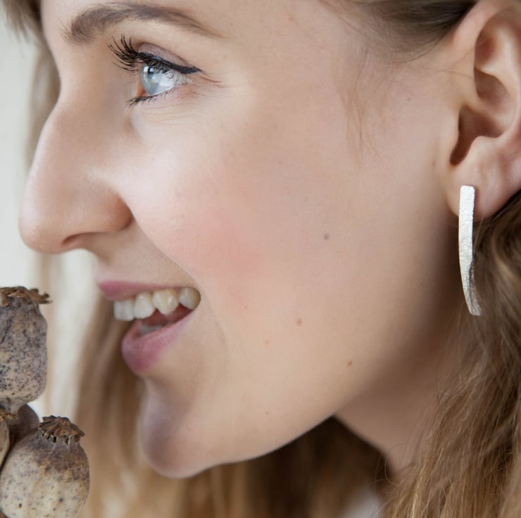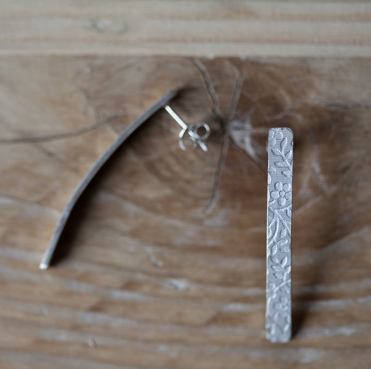 These understated recycled silver drop earrings are to be worn every day. Once embossed and hand cut the silver bar earrings have a gently curve so they hang beautifully. The front of the sustainably made earrings is matte finish while the backs are polished silver to contrast beautifully.