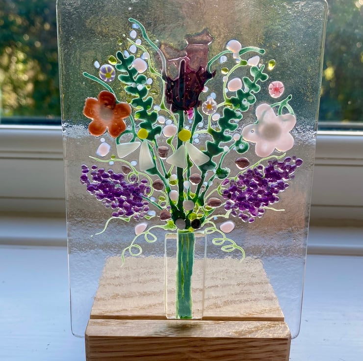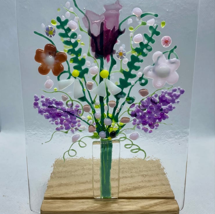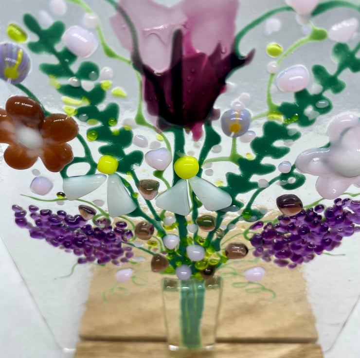 An everlasting bouquet - made using lots of hand cut glass pieces in the design of flowers in a glass vase. Added detail is achieved with hand-painted stems, leaves and greenery.