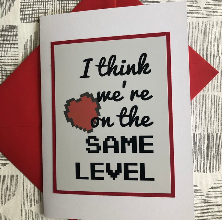 It features the phrase "I Think We're On The Same Level" in a retro pixel style font. The print is then backed onto red card and then attached to the card. The card includes a red envelope. The image is designed by myself and professionally printed onto photographic paper.