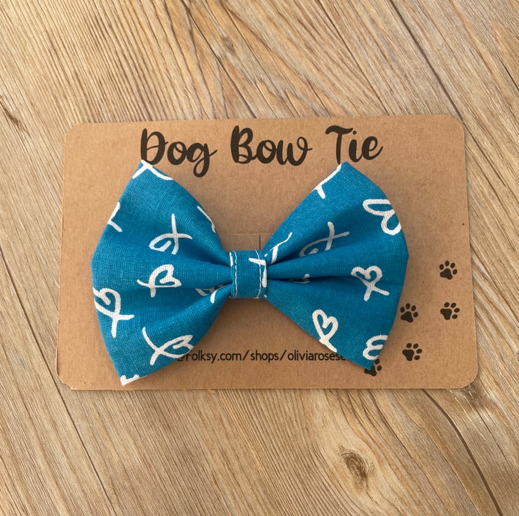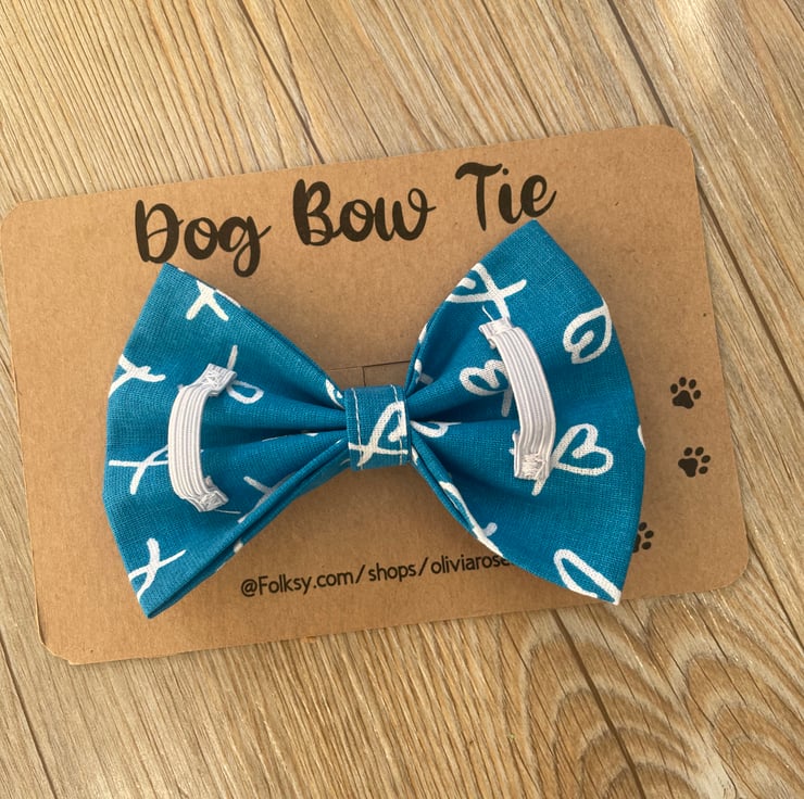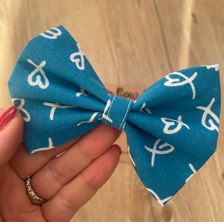 Blue with heart print bow that easily attaches to most medium cat and dog collars made with two elastic hoops on the back that slide straight onto collar. Perfect for any occasion.