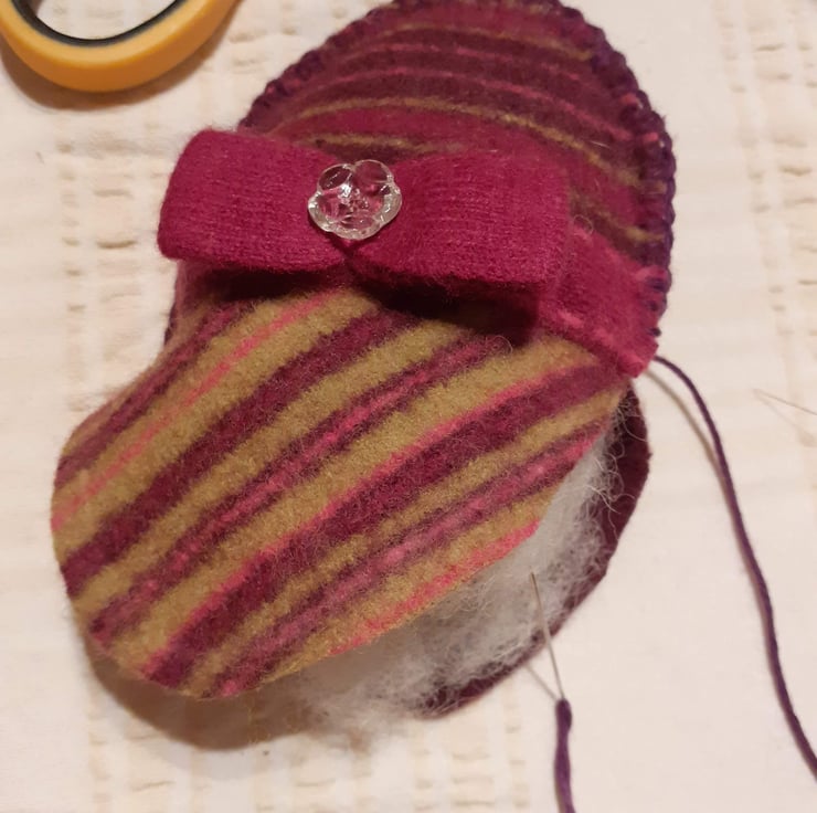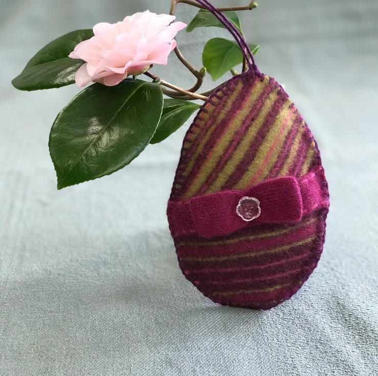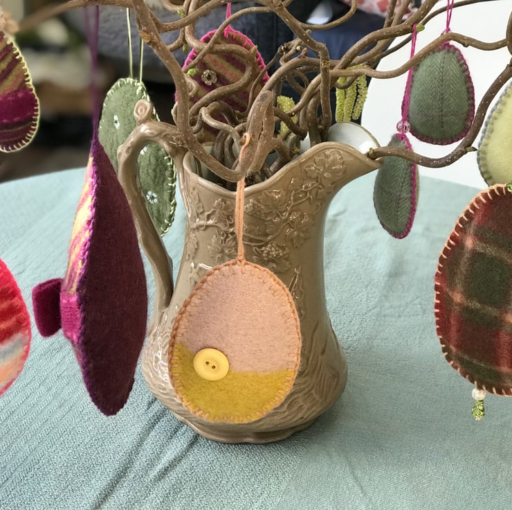 Easter decoration made from an upcycled jumper, filled with wool and hand blanket stitched. The button is a vintage glass one from my grandmother's button box.