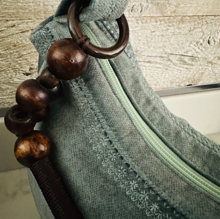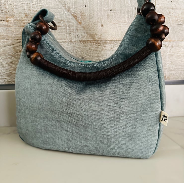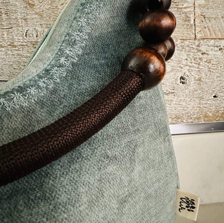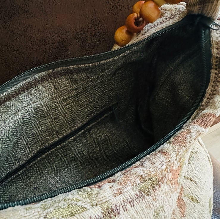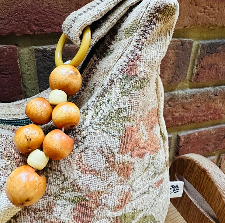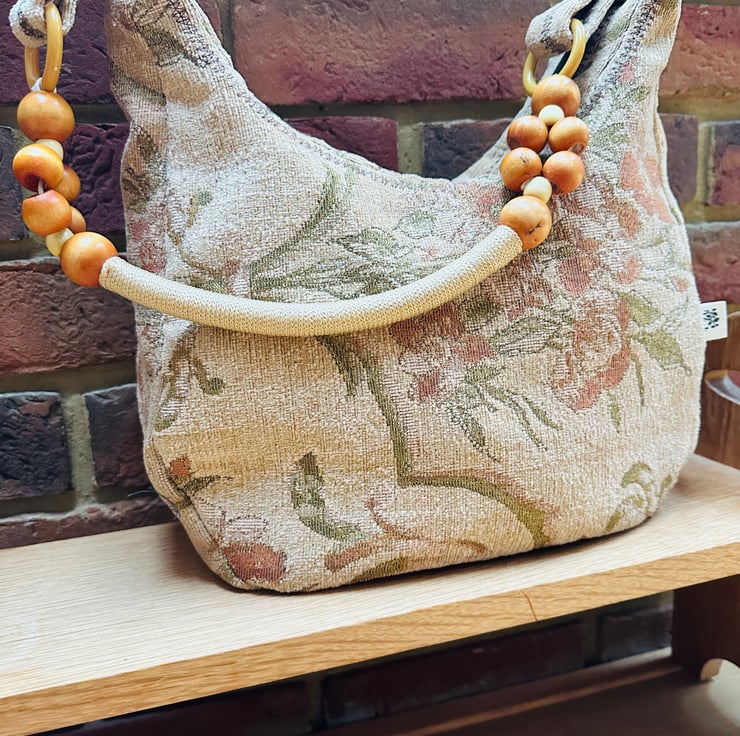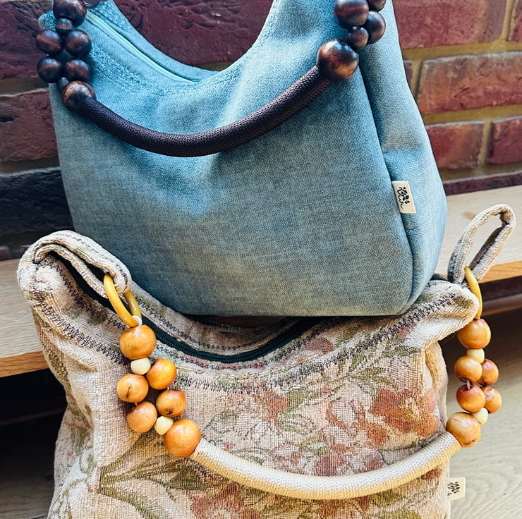 Upholstery handbags. Beautiful embroidered detail. Secure zip closure. Fully lined with inside zip pocket. Wooden beaded handle. Zero waste sustainable and eco friendly. Quality repurposed upholstery fabrics. Perfect for gifting or maybe just treat yourself. Each bag is hand made from recycled or off cut fabrics so completely unique. Handle 50cm. Two fabrics available:-