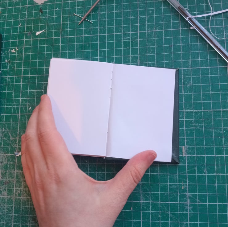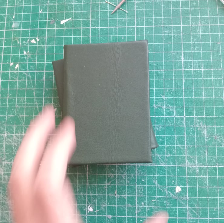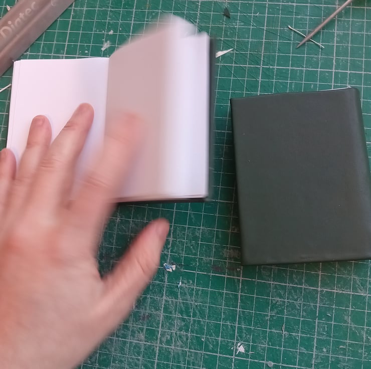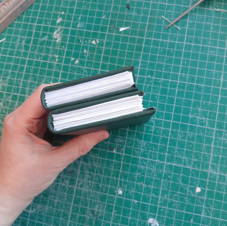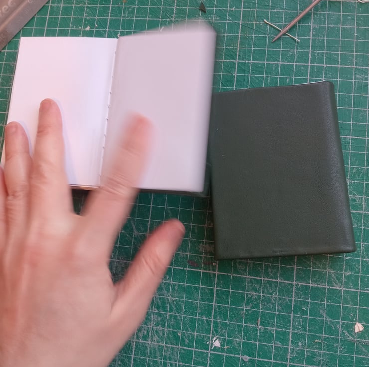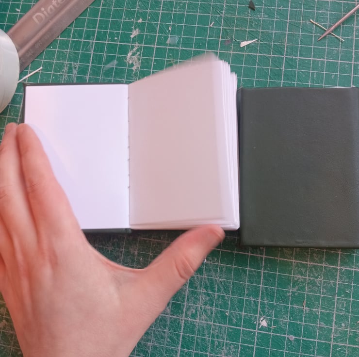 Imperfectly handmaiden dark green eather bound a7 notebook with blank white drawing paper.