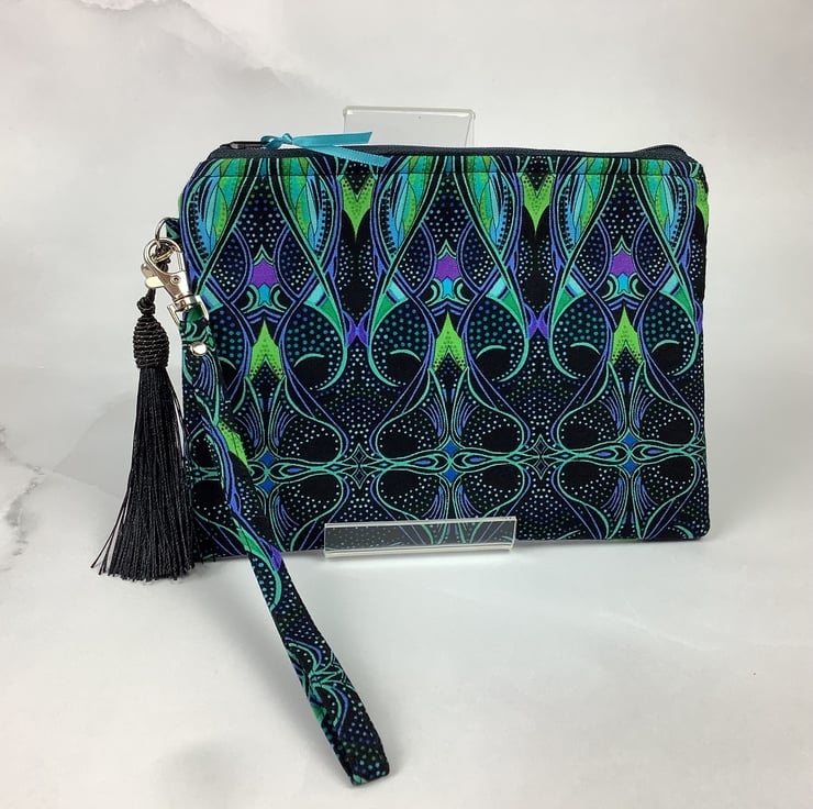 Turquoise patterned zip clutch bag wrist strap silky tassel & charm 2 options