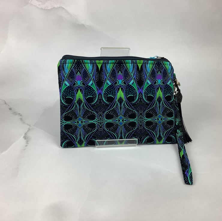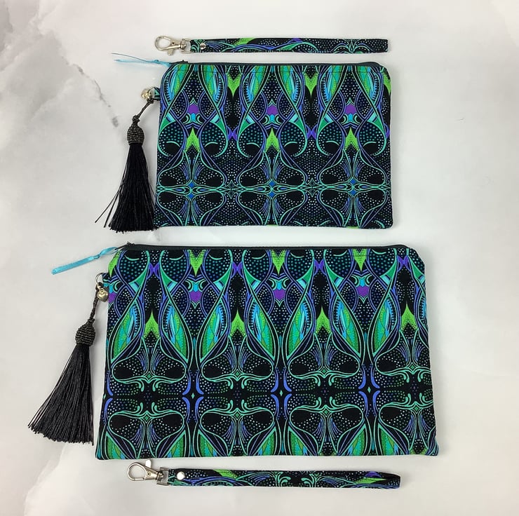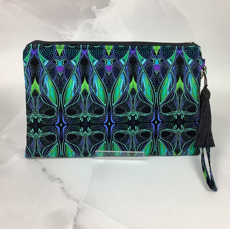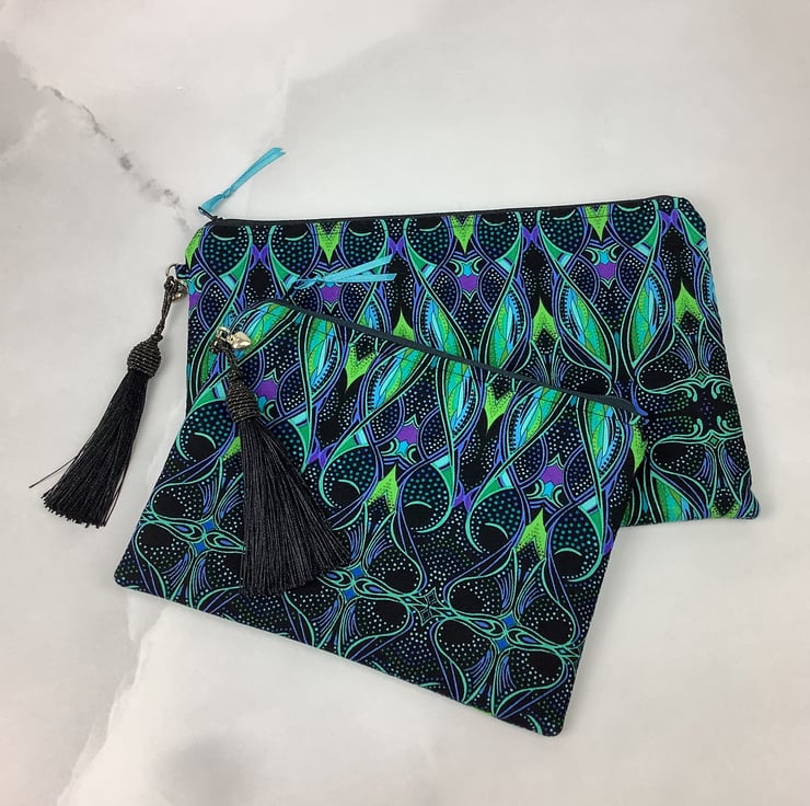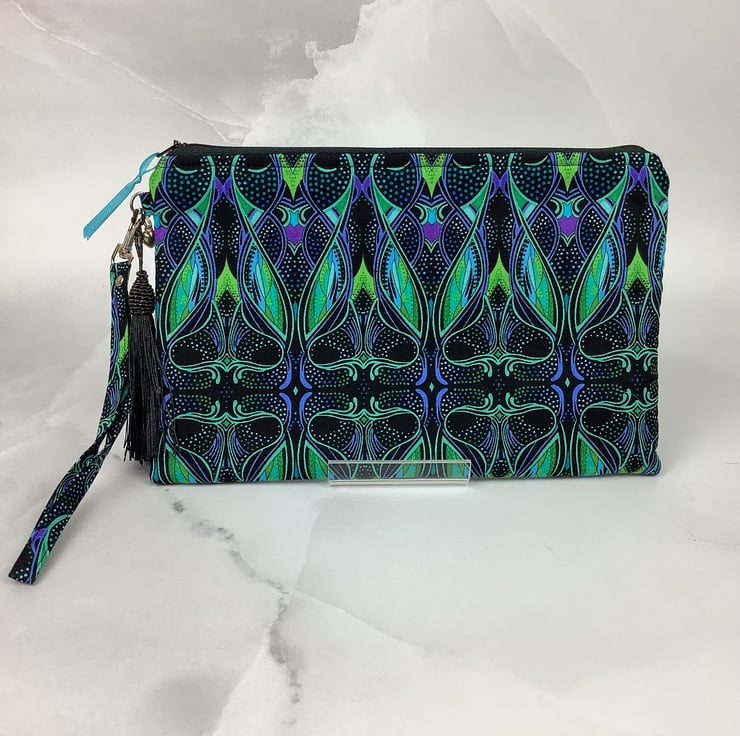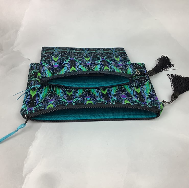 Handmade zip clutch bag in a striking and sophisticated cotton fabric lined in rich turquoise cotton in a choice of sizes.