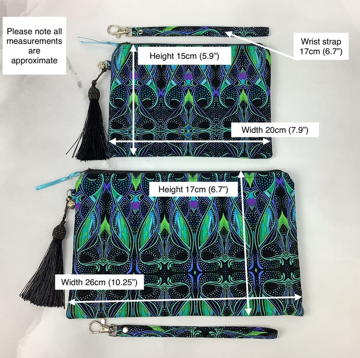The detachable wrist strap is long enough to fit comfortably on your wrist and finished it with a silky tassel, charm and ribbon on the zipper pull. I have added a dense interlining to give it a lovely plush feel and finished it with a silky tassel, charm and ribbon on the zipper pull.