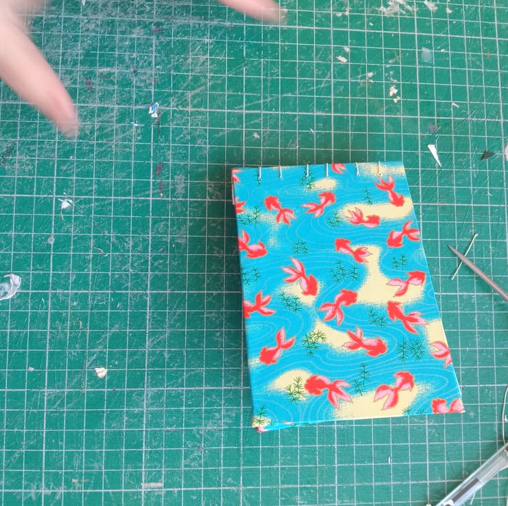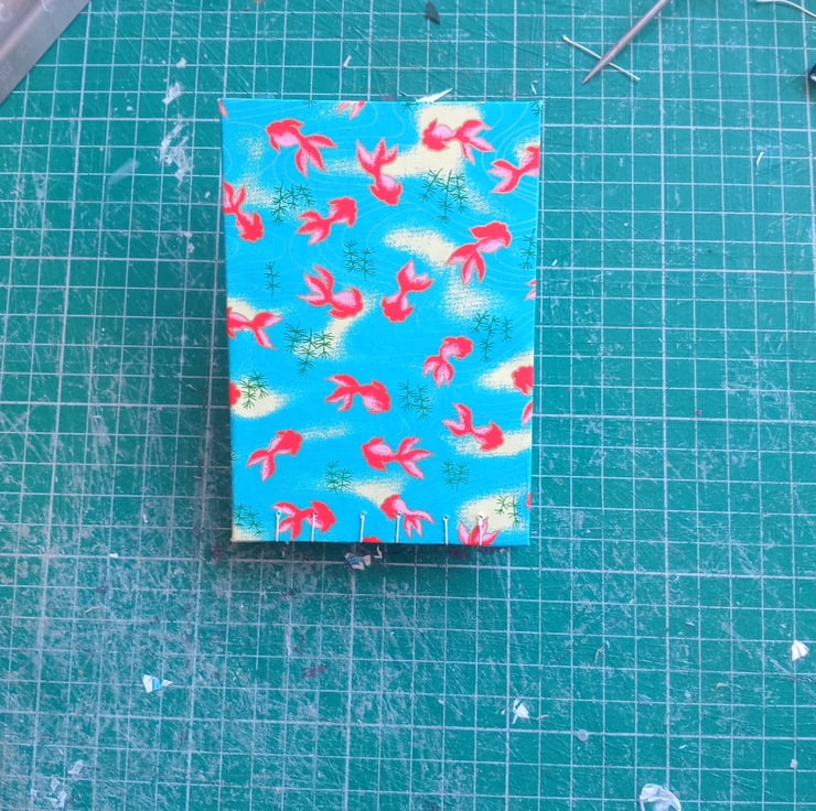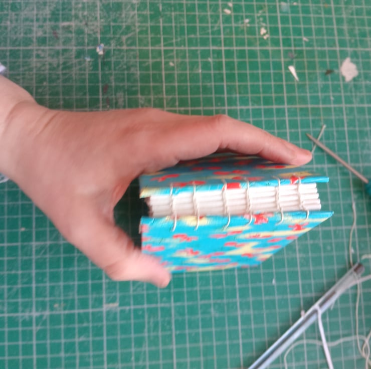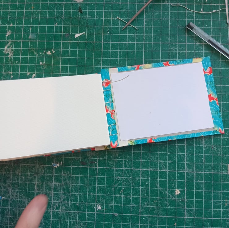 Flawed / imperfectly made with watercolour paper, greyboard, linen thread and japanese decorative paper stitched in coptic stitch binding