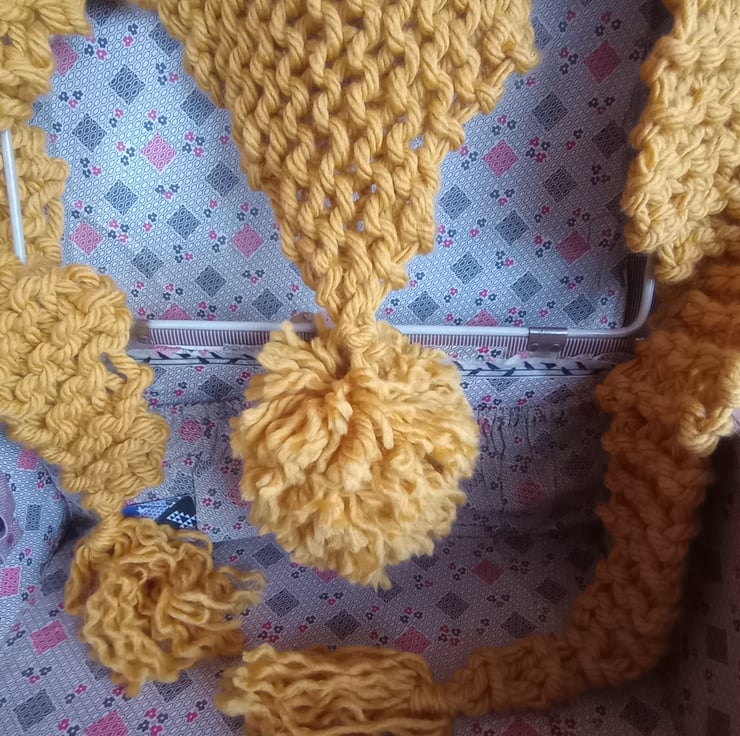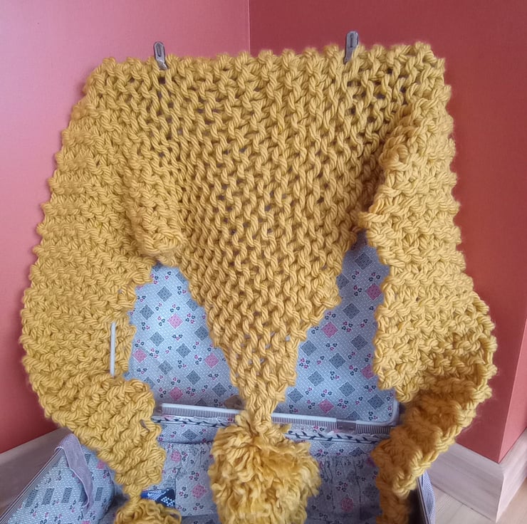 Heavyweight Hand knitted shawl in Ochre Yellow with Large Pom Pom detail.