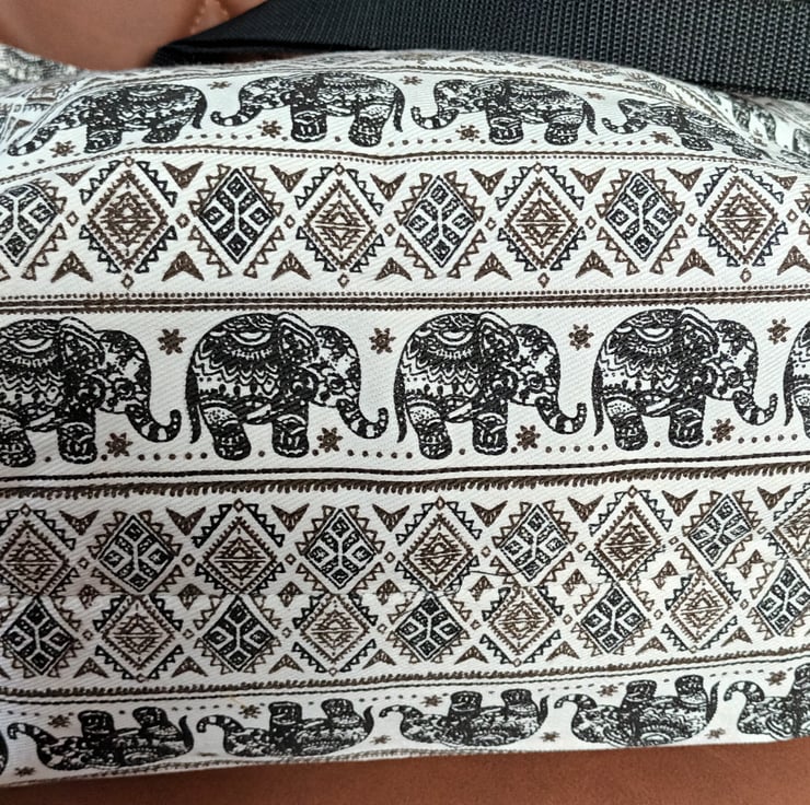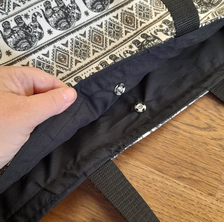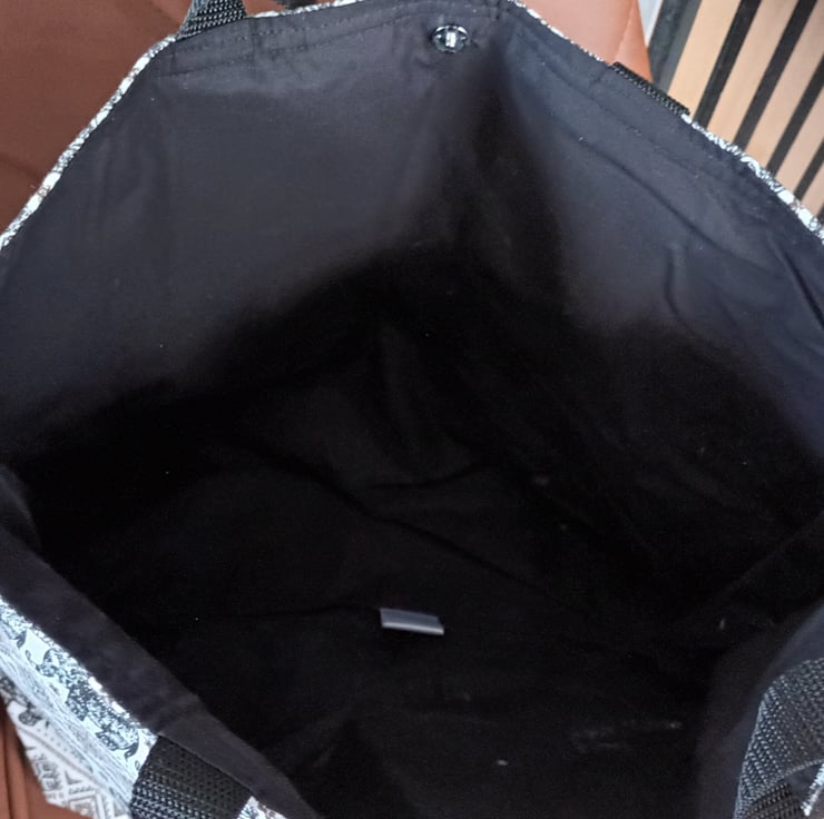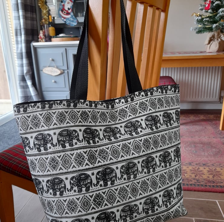 A lovely strong, black and white tote bag with press stud fastening, Elephant design with an Aztec pattern. The bag can be tucked under your shoulder or over your arm. Black lining inside, with strong black polypropylene webbed strap handles. The fabric is 100% cotton canvas to the outside and 100% black cotton inside.