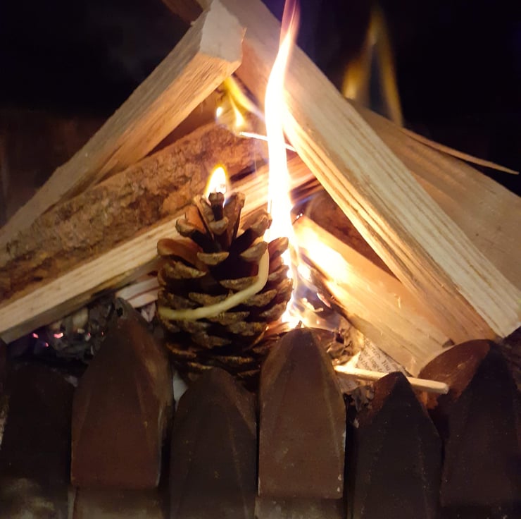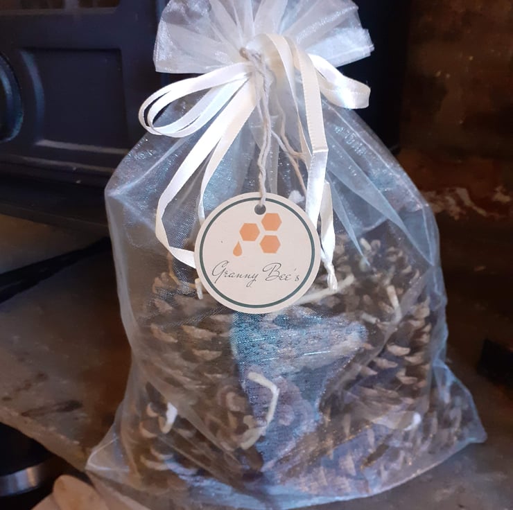 Firelighters made from fircones wrapped with wick and dipped in pure beeswax. Only one needed to light a fire. Can be used in a fireplace, stove or outside in a firepit.