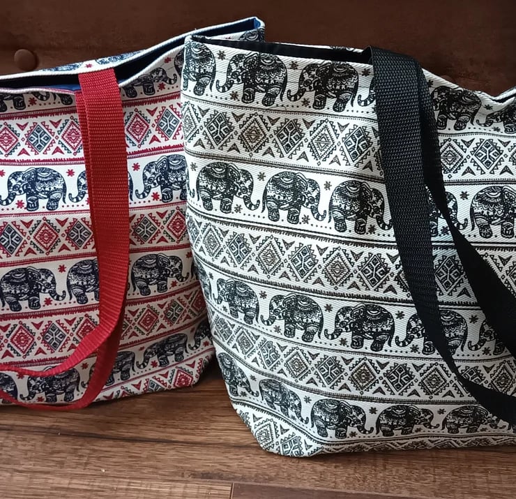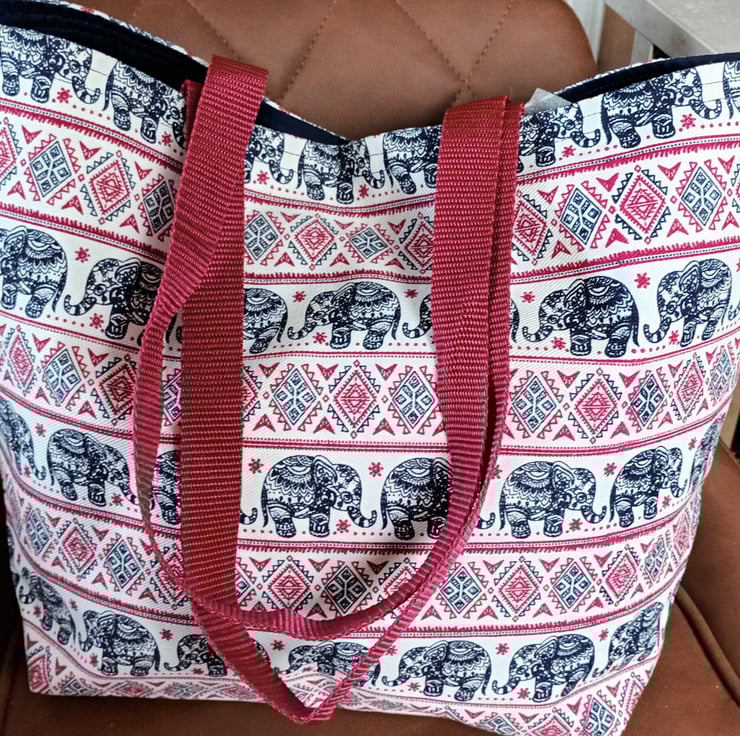 A lovely strong red and navy blue tote bag with press stud fastening, Elephant design with an Aztec pattern. The bag can be tucked under your shoulder or over your arm. Navy lining inside, with strong red polypropylene webbed strap handles. The fabric is 100% cotton canvas to the outside and 100% black cotton inside.