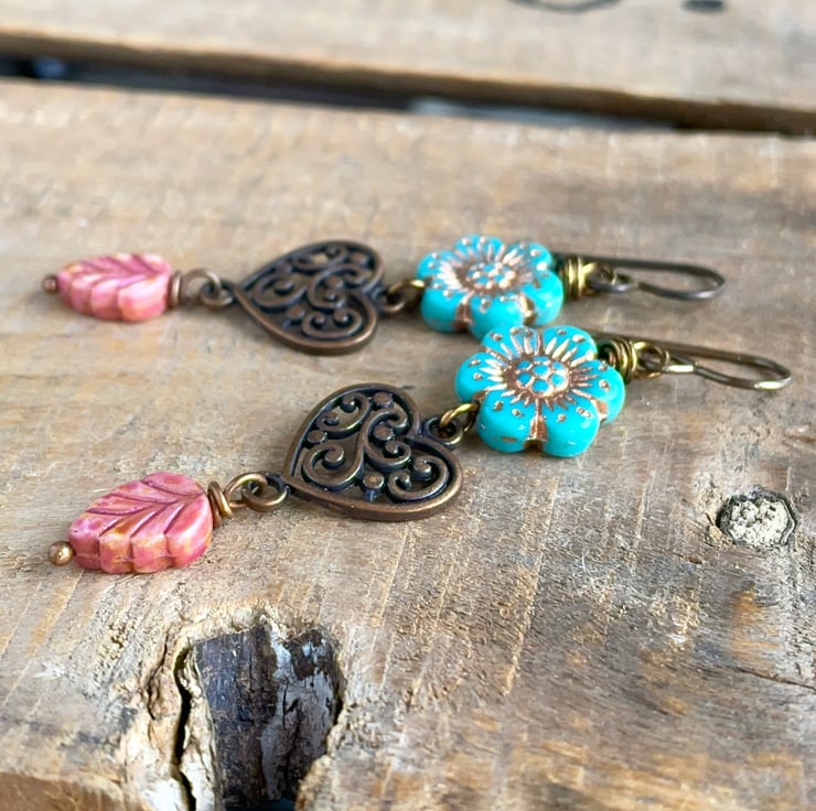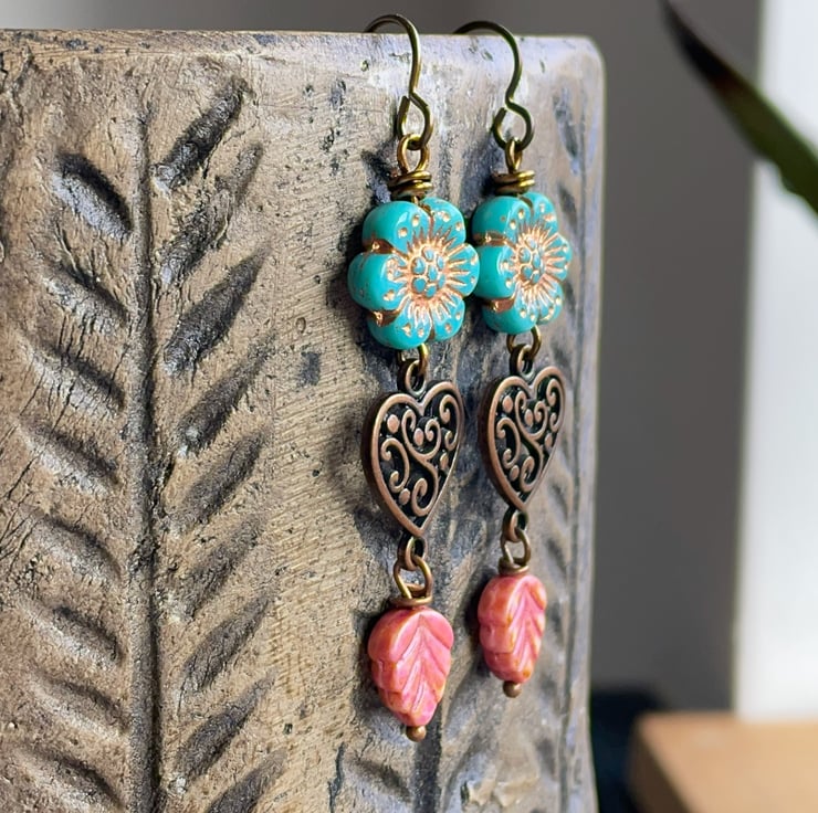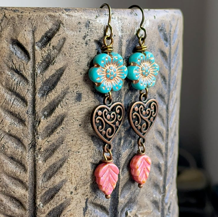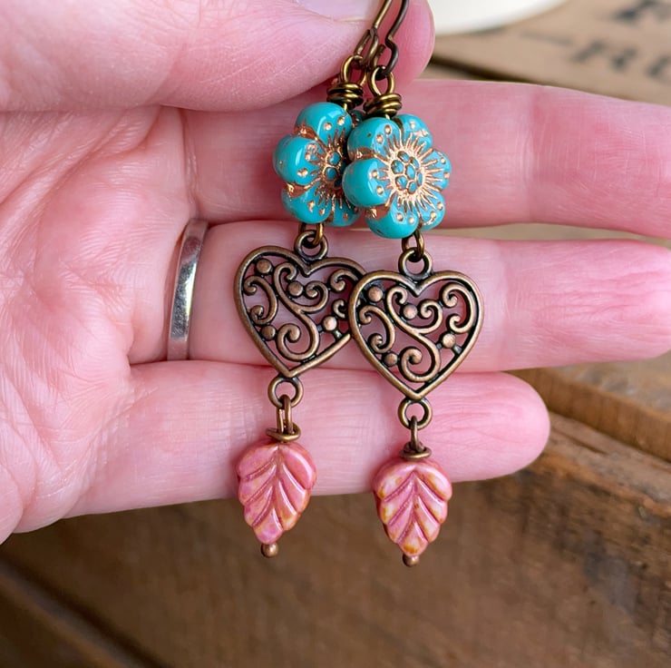 Dangling below, ornate dark copper-toned heart connectors with an elegant swirl design are paired with rustic rose-pink Czech glass leaves.