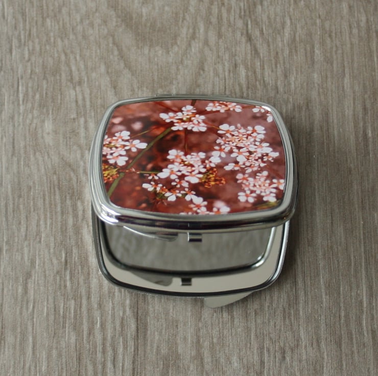 The solid square metal compact case has curved corners and 2 mirrors inside. It measures 6.5cm x 6.5cm and has a sturdy clasp which snaps the case shut.
