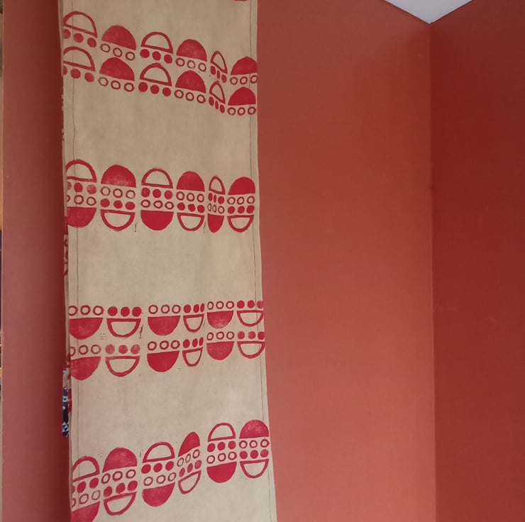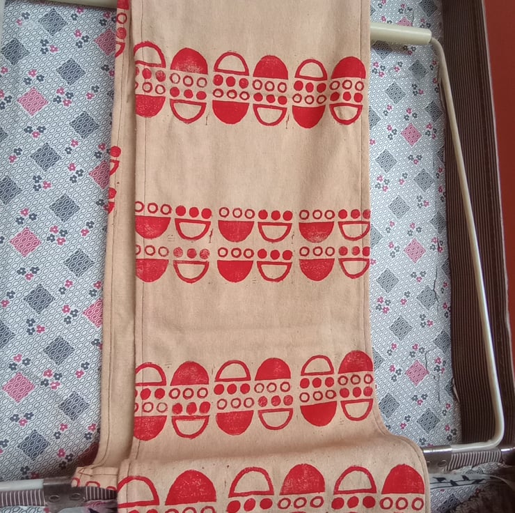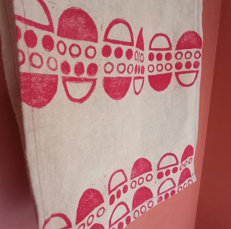 Hand dyed using apple bark chip from orchard tree prunings, then hand carved and hand printed with lino block, the pattern being inspired by the many south west sun sets we see here.