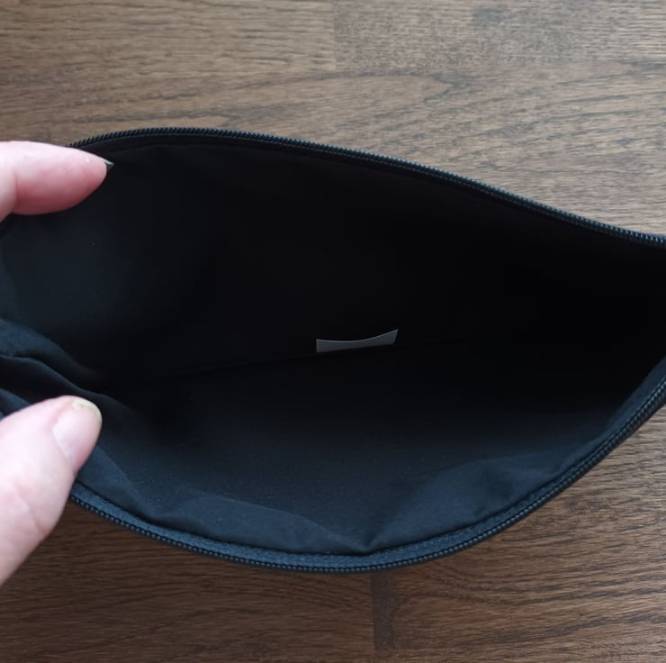 Pencil Case for a Gamer, Girls or Boys. Black background with gaming words and motifs in bright colours. 100% cotton with stabilizing fabric and black nylon zipper.