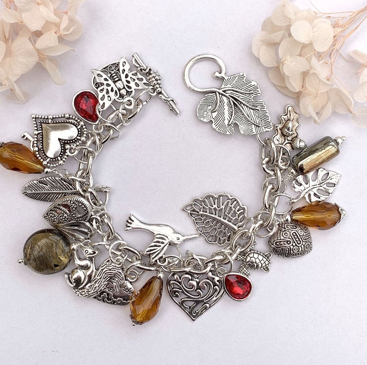 This pretty heart theme charm bracelet is made with a collection of silver heart charms, nature charms plus glass and gemstone charms.