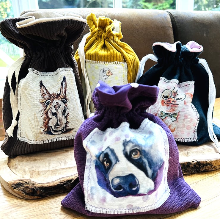 Beautiful fully lined bags with hand drawn design. Quality fabric. Fully lined. Perfect for gifting or maybe just treat yourself. Each bag is handmade from recycled and off cut fabrics so completely unique. Choose from 3 designs :