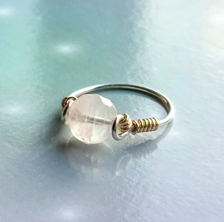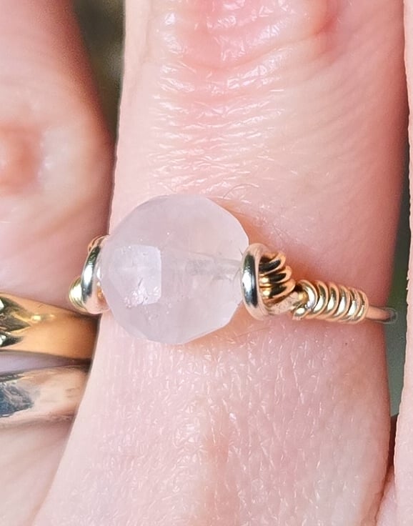 Carefully hand-wrapped with recycled sterling silver wire, this ring features a gorgeous faceted (near round) Rose Quartz gemstone in a pretty light pink hue. It's a stunning stone that has tiny iridescent flecks that shimmer in the light!