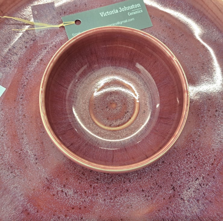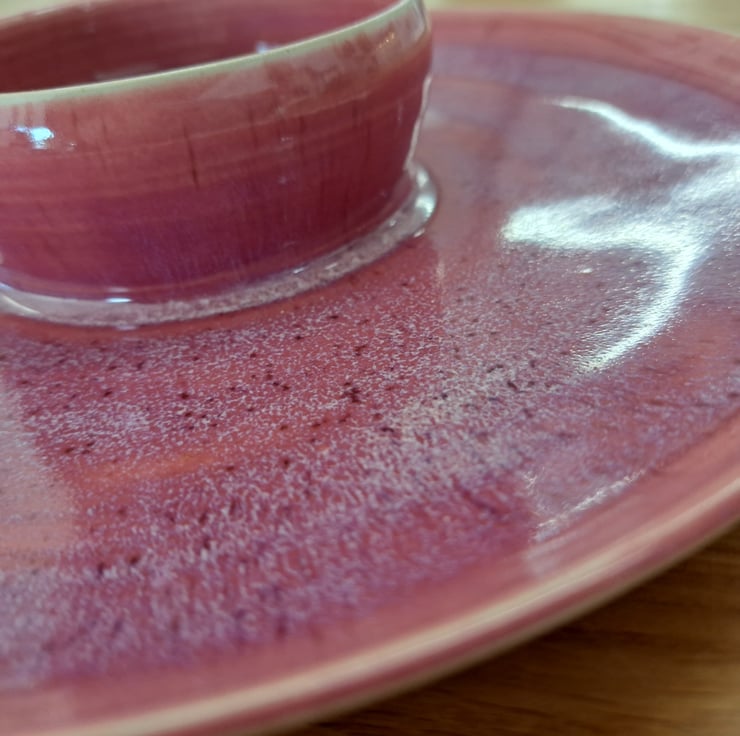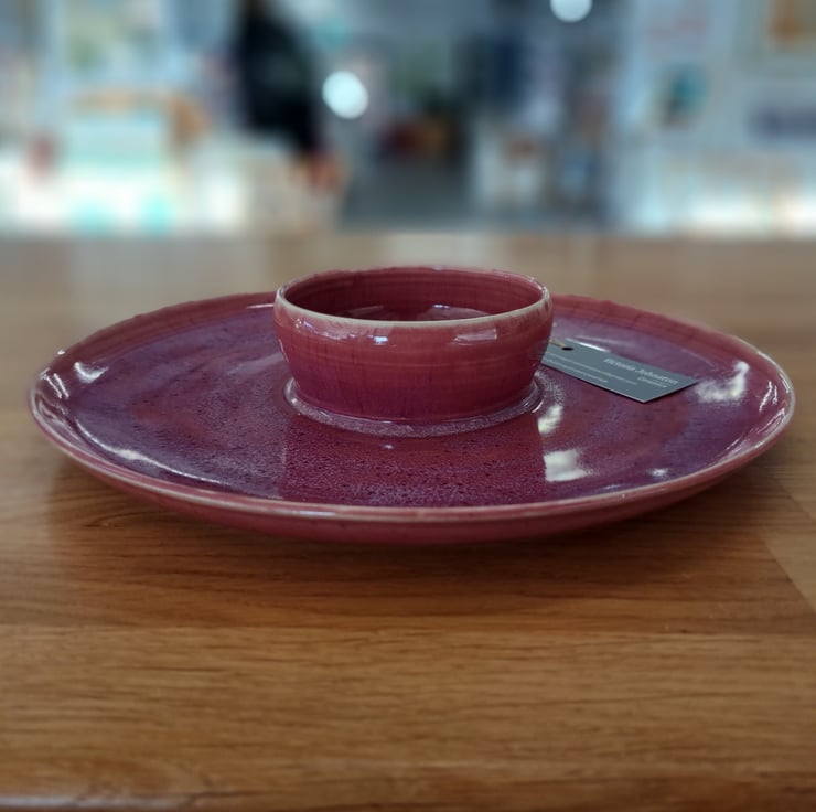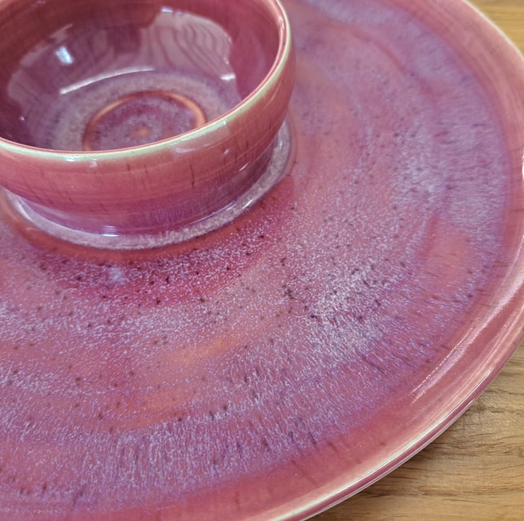 A hand made dip and chip plate, which has been thrown in one piece on the potters wheel and glazed in a mottled glossy mulberry.
