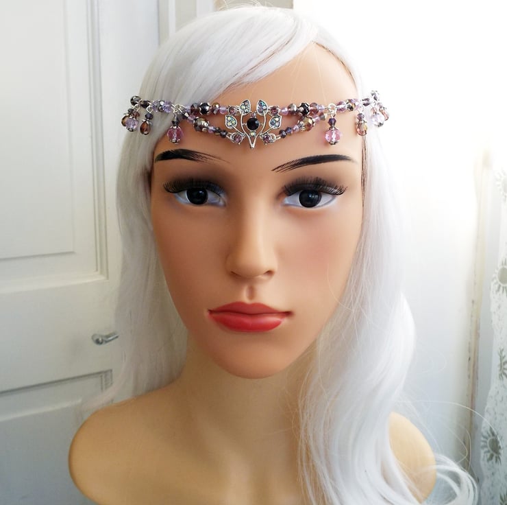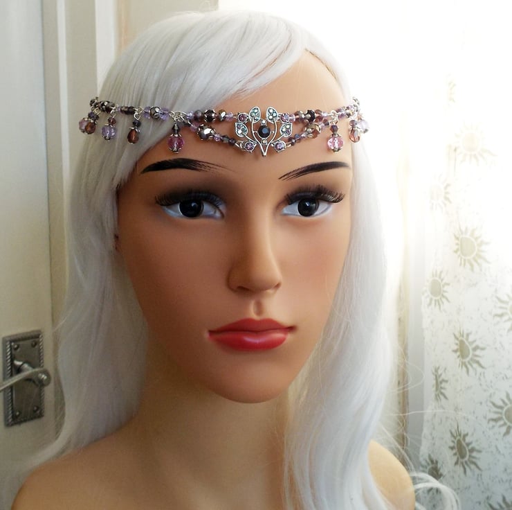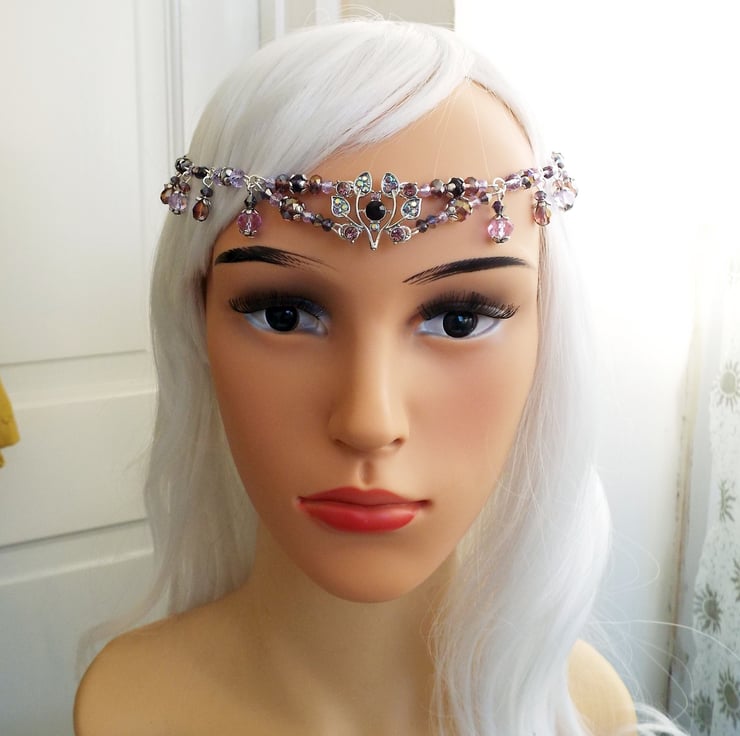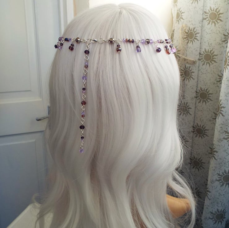 Stunning Diamante & crystal glass beaded headpiece in a myriad of purple from pale violet to dark amethyst. A central thistle styled rhinestone set adornment & a multitude of faceted round, rondelle, bicone & teardrop glass beads. I have accented here & there with a smattering of silver tone flower petal bead caps & finished the piece off with a beaded extender chain. Fastens to the back with a silver plated lobster claw clasp.