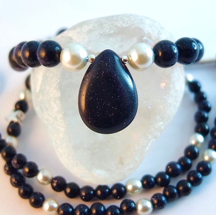 The centrepiece features a 13x18mm Blue Goldstone pendant highlighted with tiny sterling silver spacers and 6mm Czech glass Pearls.