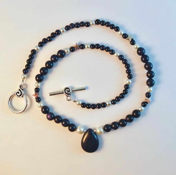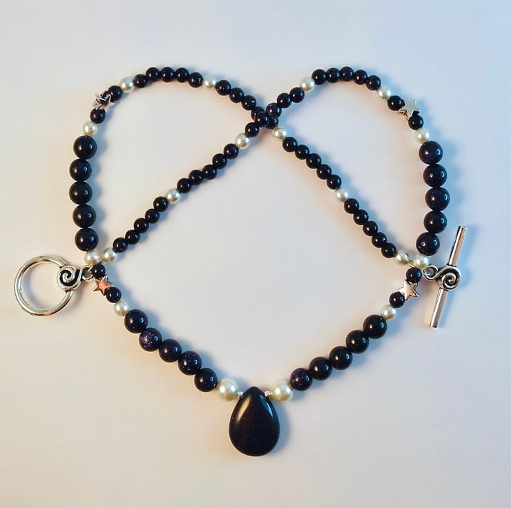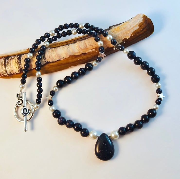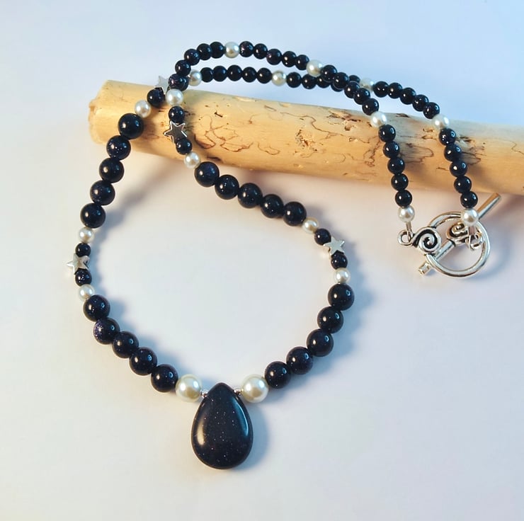 Deep blue Goldstone necklace embellished with palest blue Czech glass Pearls and 5mm Tibetan silver stars.