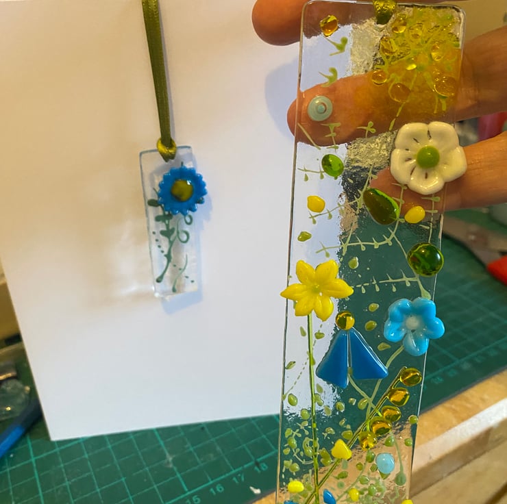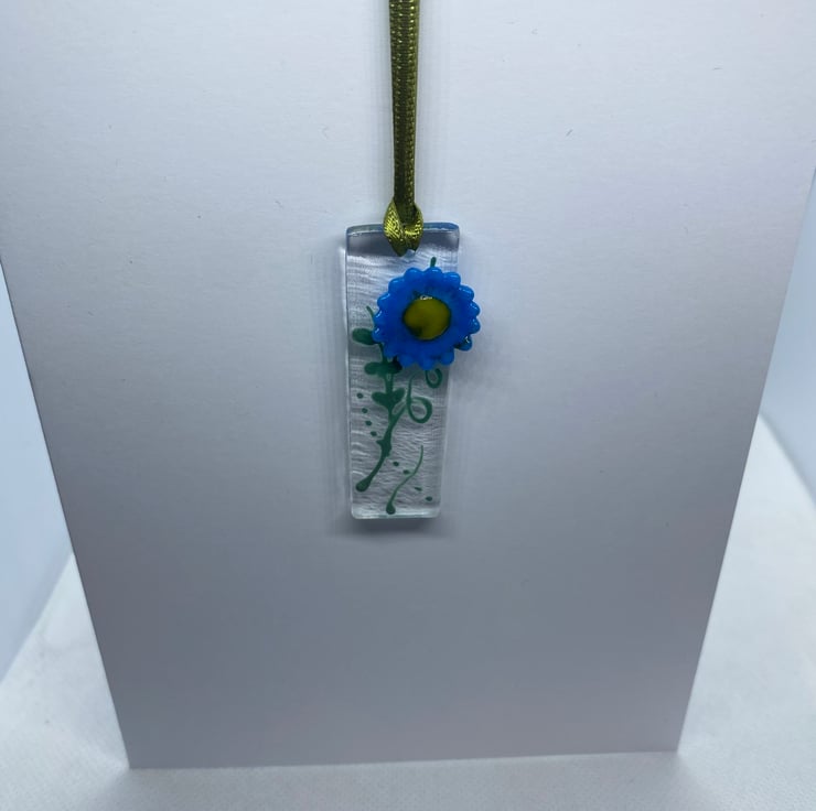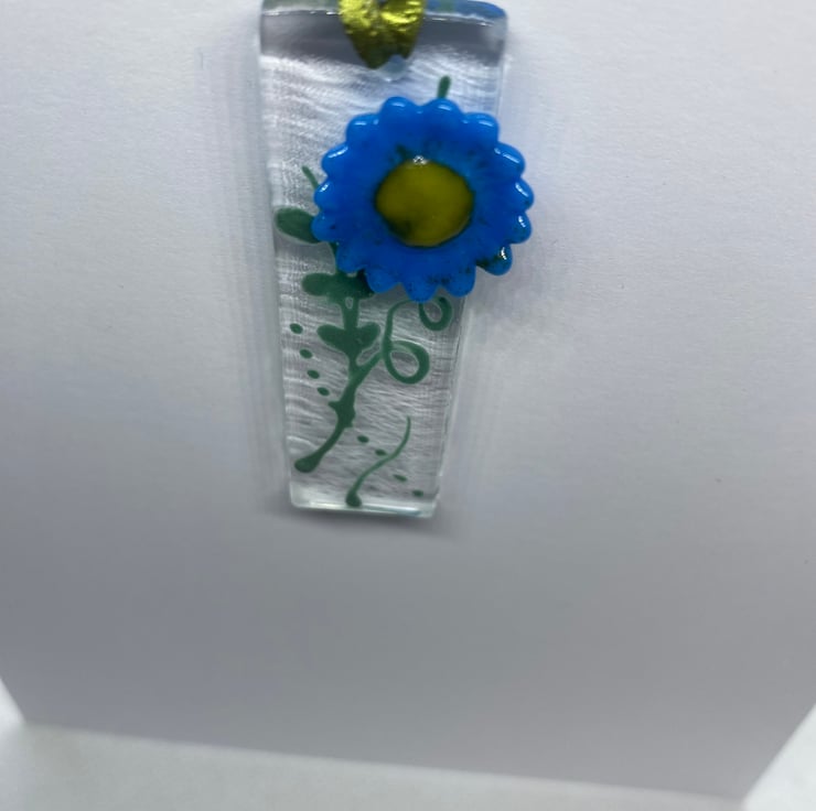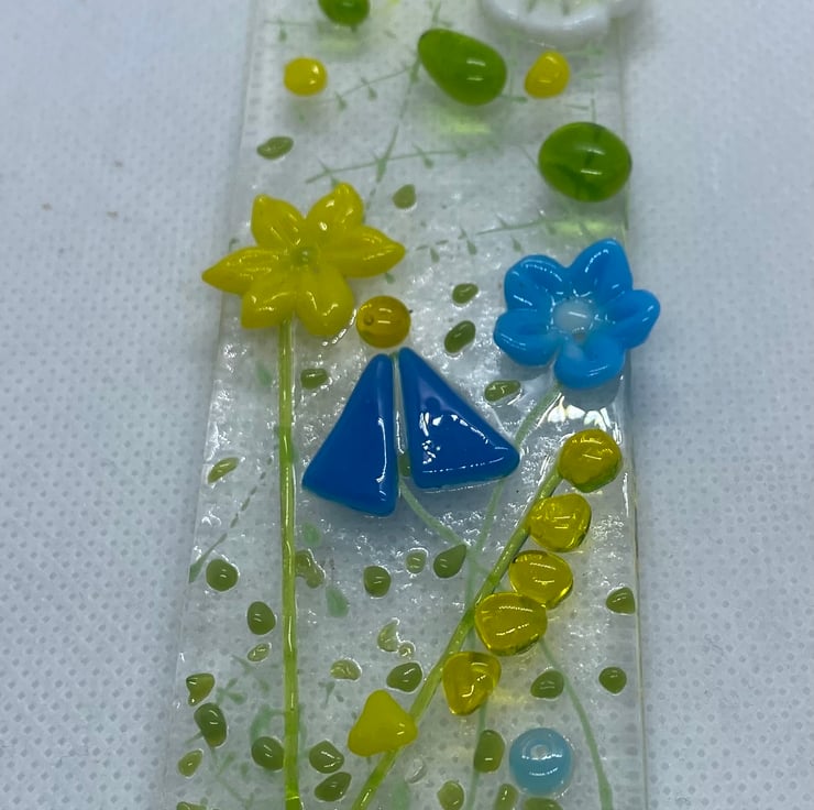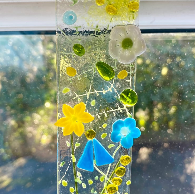 A pretty hanging lightcatcher in shades of blue and yellow with handpainted stems and leaves and larger flowers made by mixing tiny glass granules with water and freezing them solid into moulds so they can be popped out and fused to a glossy shine on the glass panel.