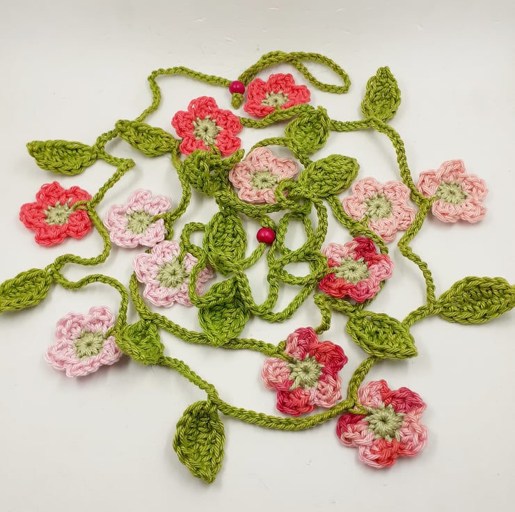 This happy garland of flowers and leaves is crocheted in cotton and has a wooden bead at each end for easy tying. The flowers have pale green centres and the petals have been crocheted in 3 repeats of pink, peach and coral shades. The whole garland measures just over 2m in length and comes wrapped in tissue in a labelled PIP (Postage in Proportion) box, all ready to be given or posted on as a gift if required. A tag with a printed message of your choice can be added to the box, please just message me if placing an order.